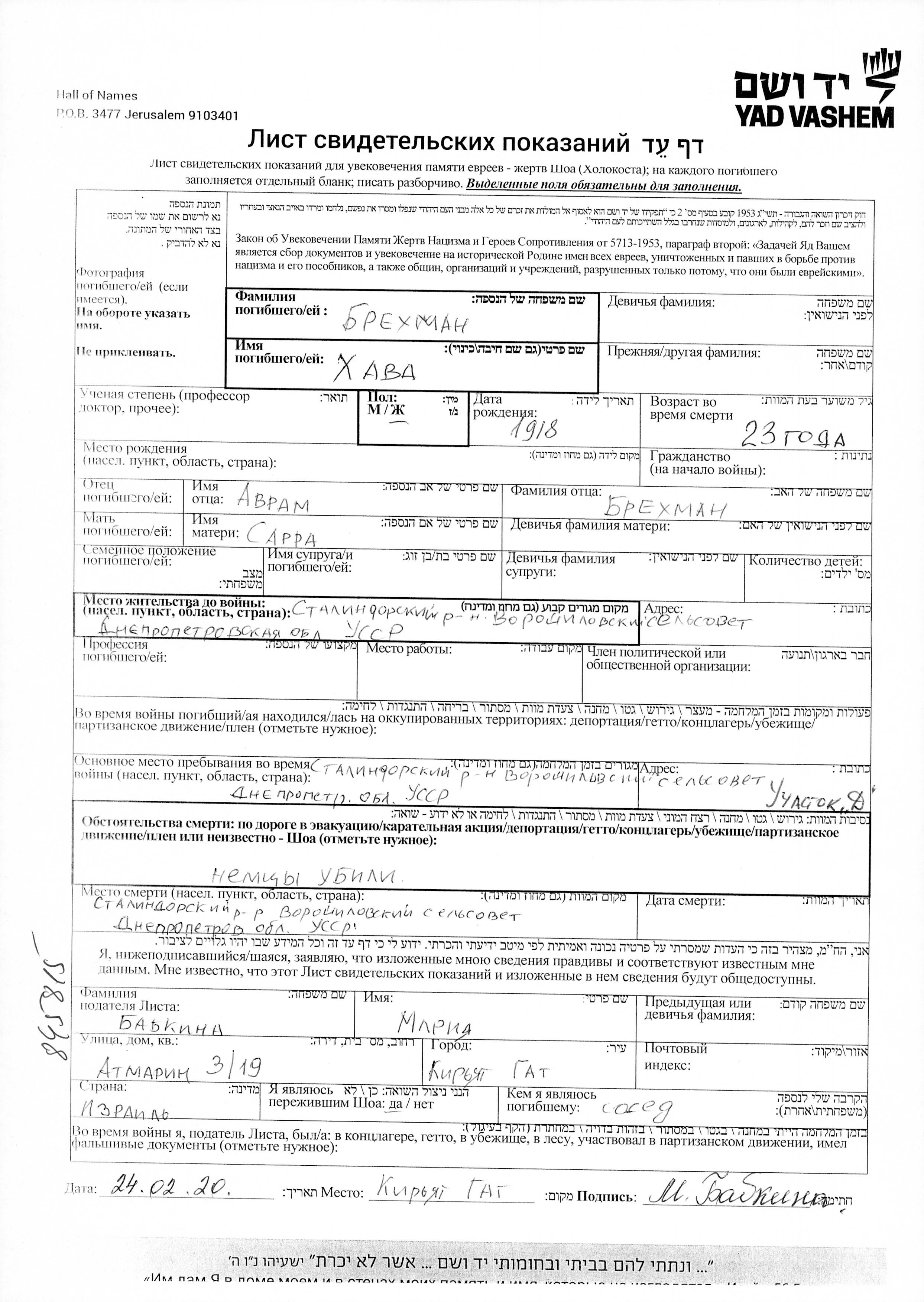 Хава Брехман. Отец: Аврам, mать:Сарра. Место жительства до войны: Сталиндорфский Р-н, Украина (СССР). Место во время войны: Сталиндорфский Р-н, Украина (СССР).