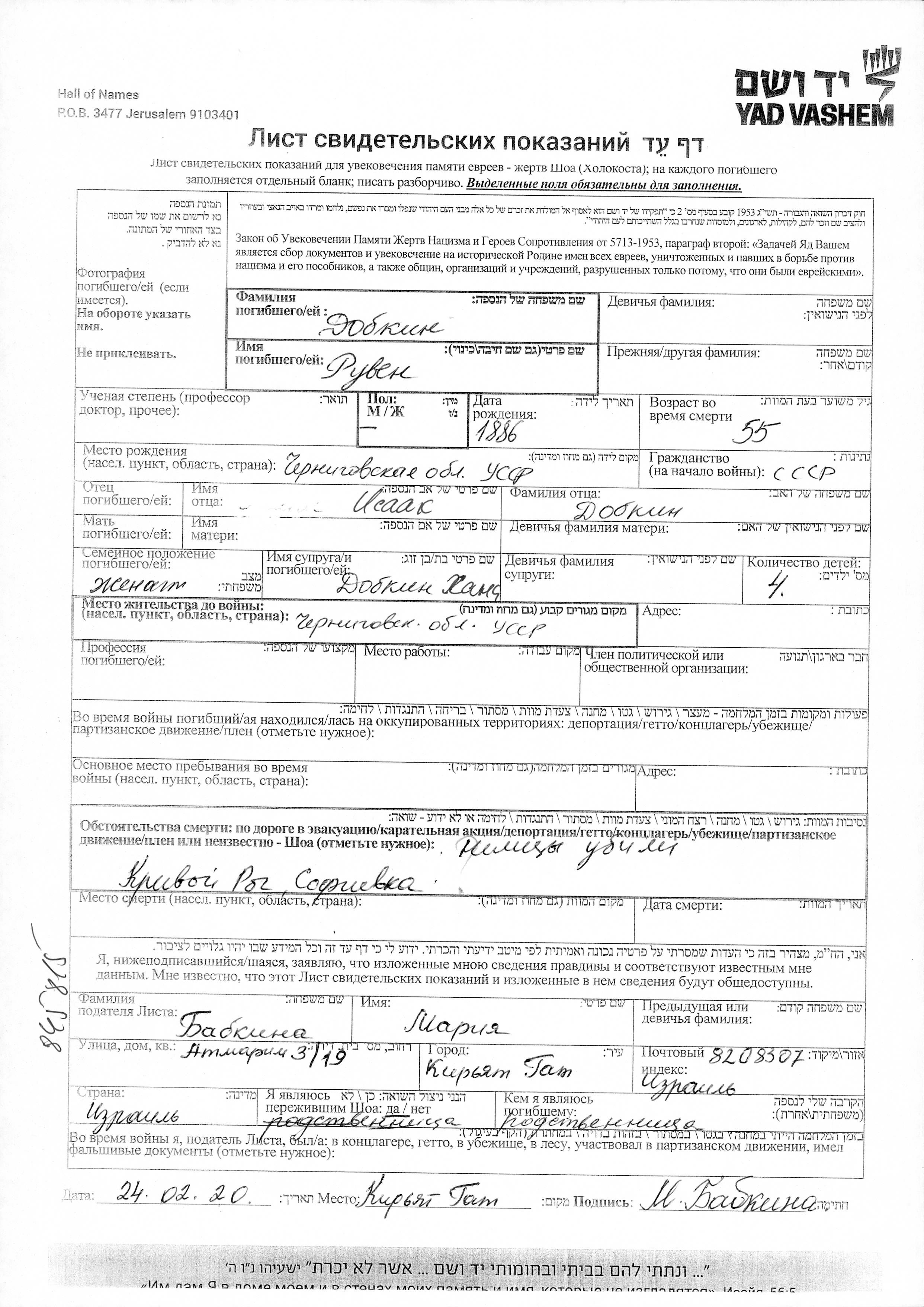 Добкин Рувен 1886 Украина (СССР) Лист свидетельских показаний