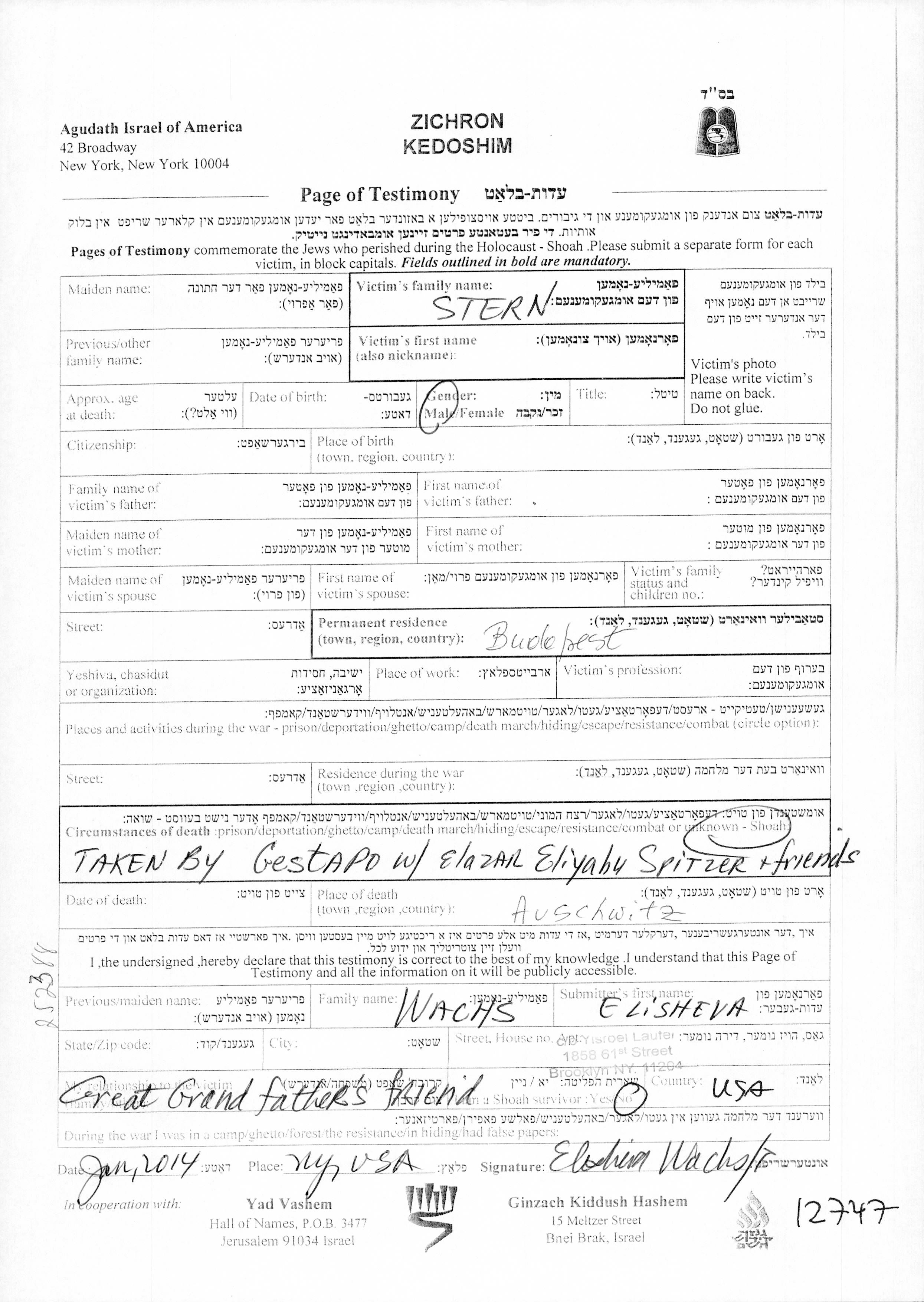Штерн Имя неизвестно Будапешт, Венгрия Лист свидетельских показаний