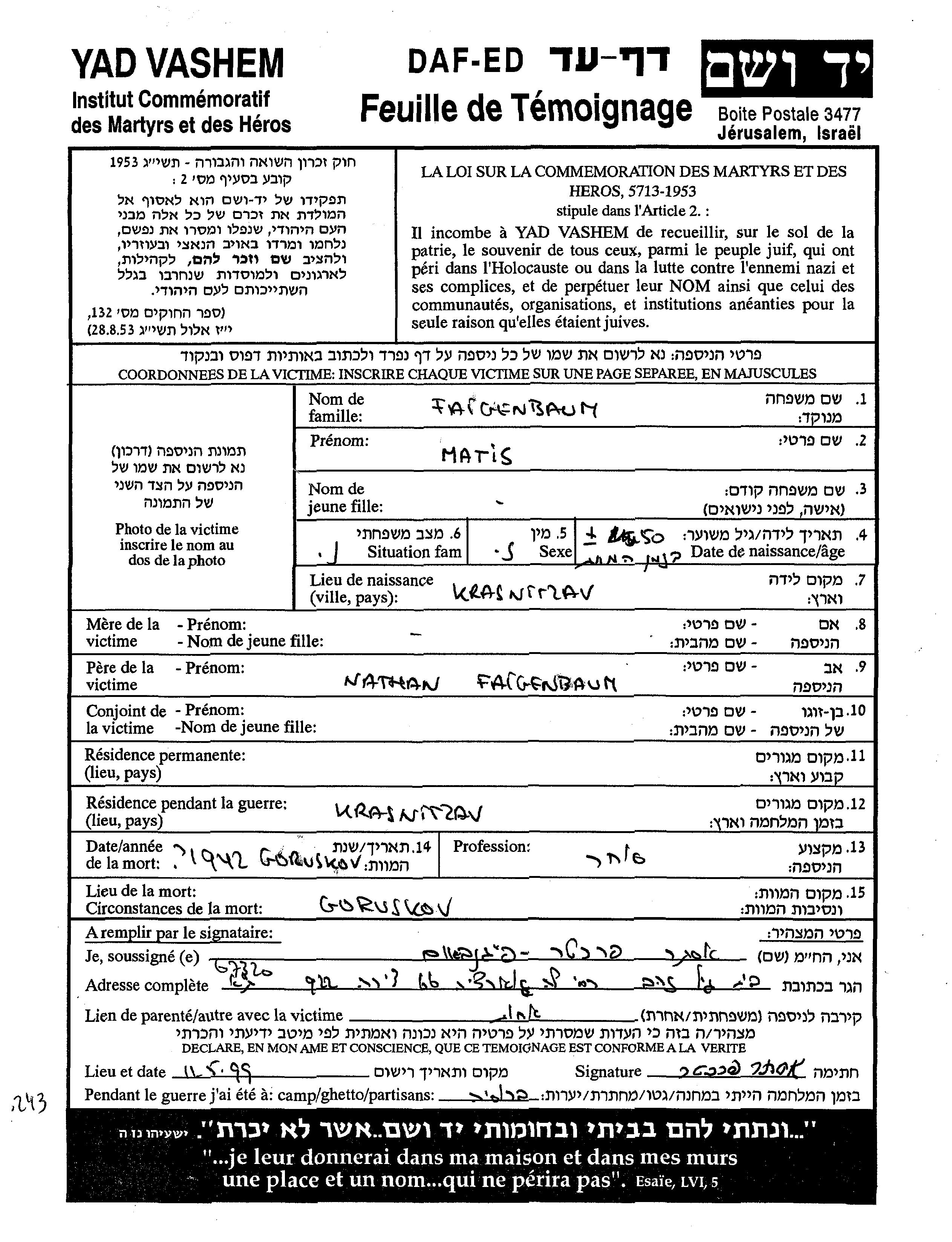 Файгенбаум Матис Красныстав, Польша Лист свидетельских показаний
