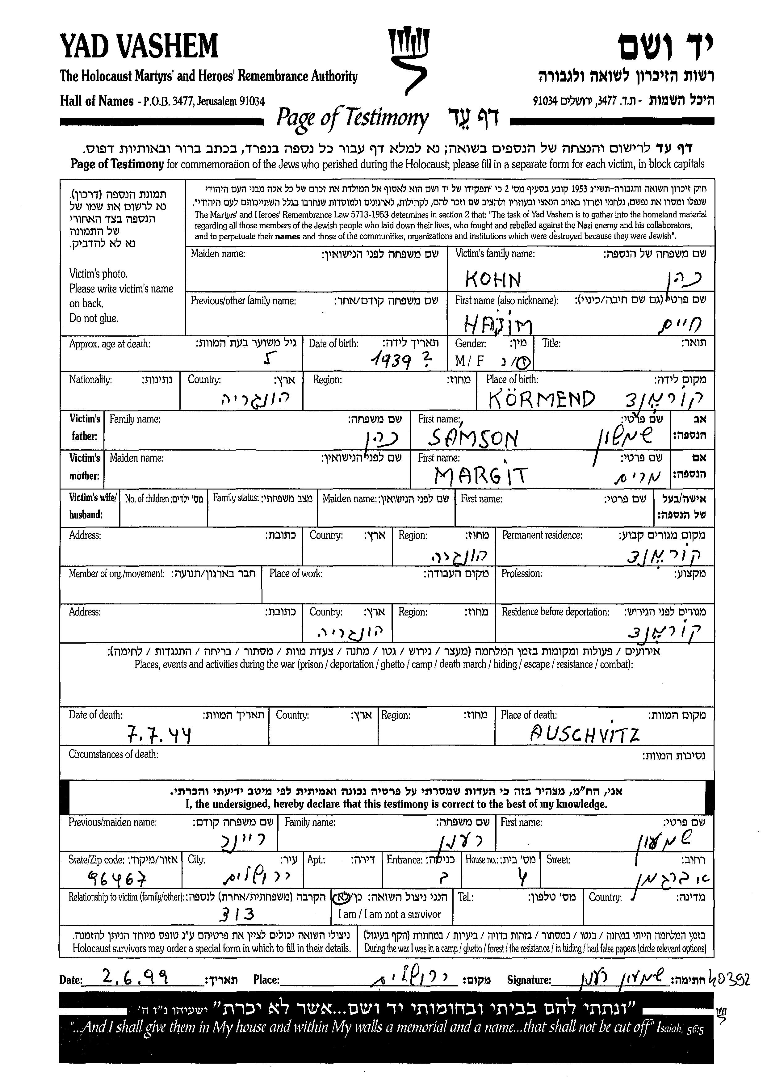 Коэн Хаим 1936 Кёрменд, Венгрия Лист свидетельских показаний