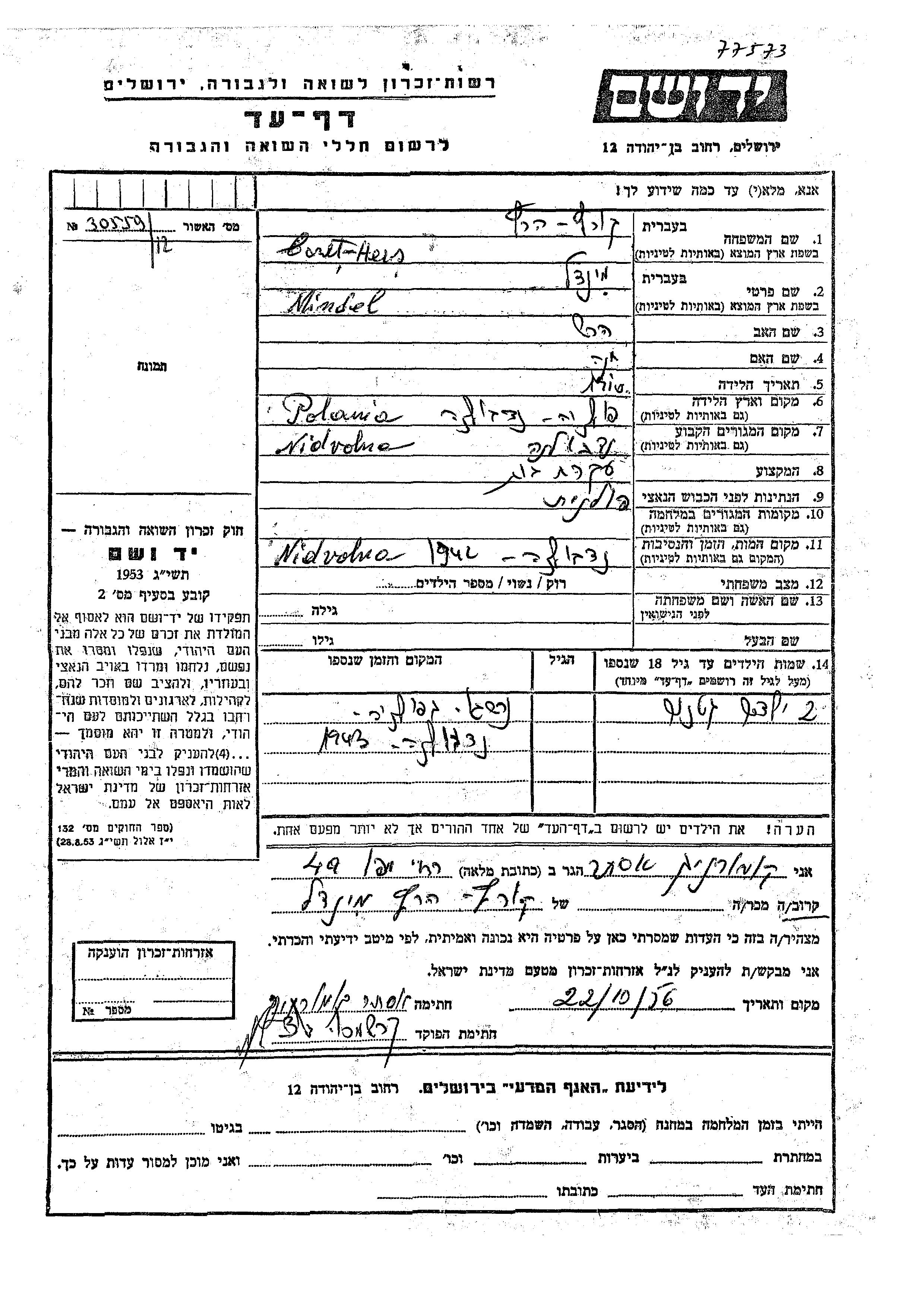 Миндель Корец Херш Курц Херц, место рождения: Надворная, Польша. Отец: Герш, mать:Хана. Домохозяйка. Место жительства до войны: Надворная, Польша.
