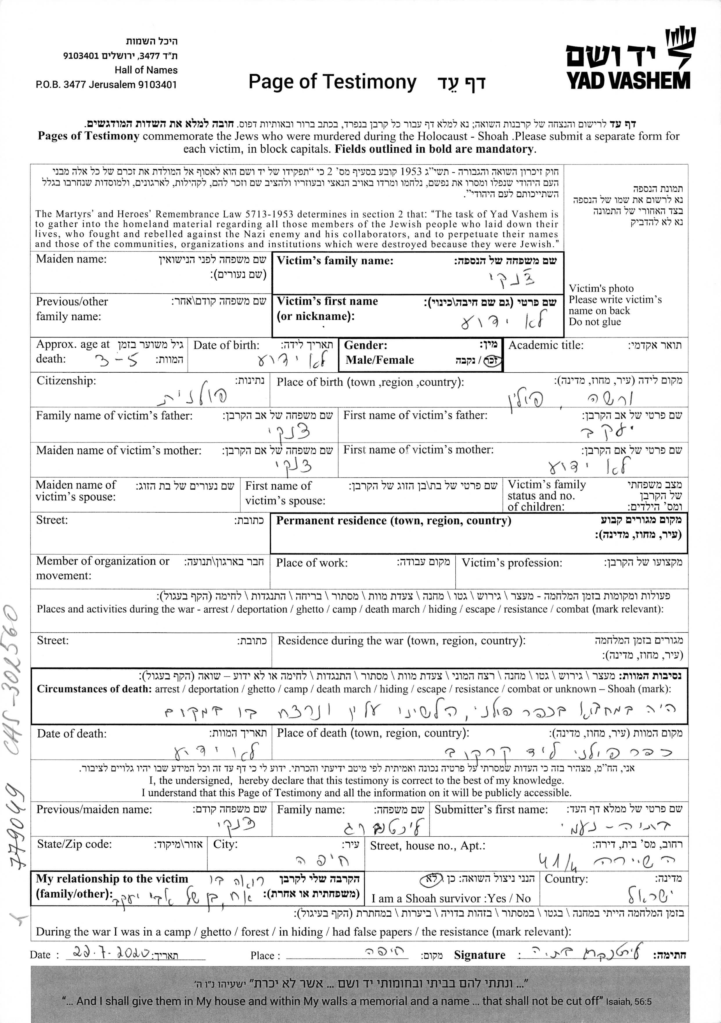Яд Вашем - Листы свидетельских показаний Мемориального фонда