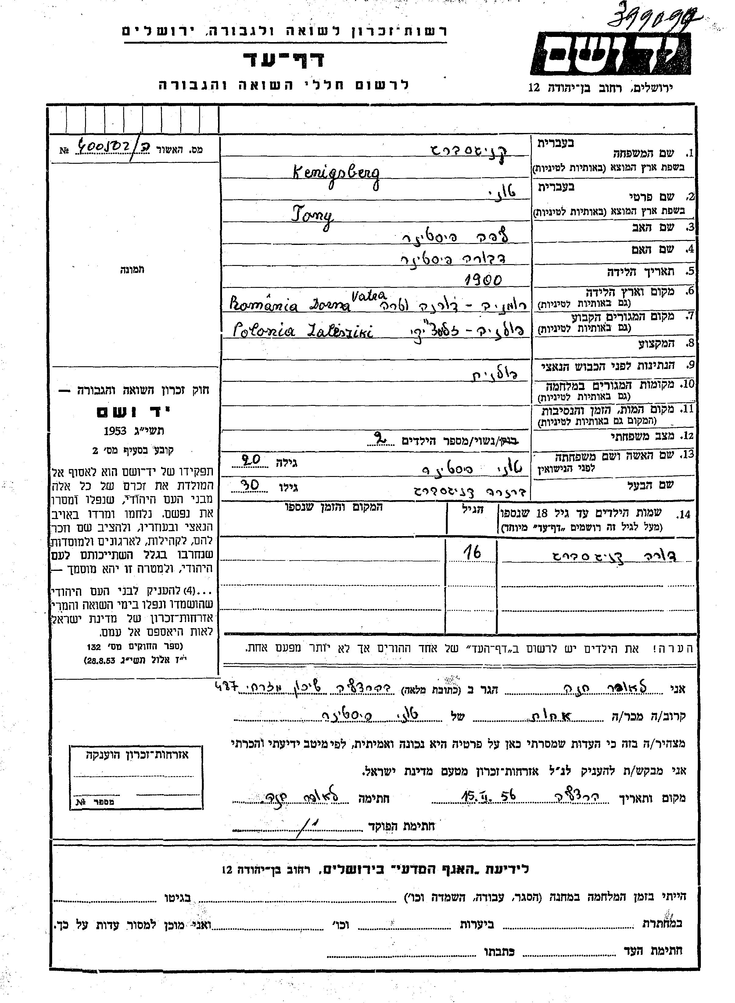 Кенигсберг Дора Залещики, Польша Лист свидетельских показаний