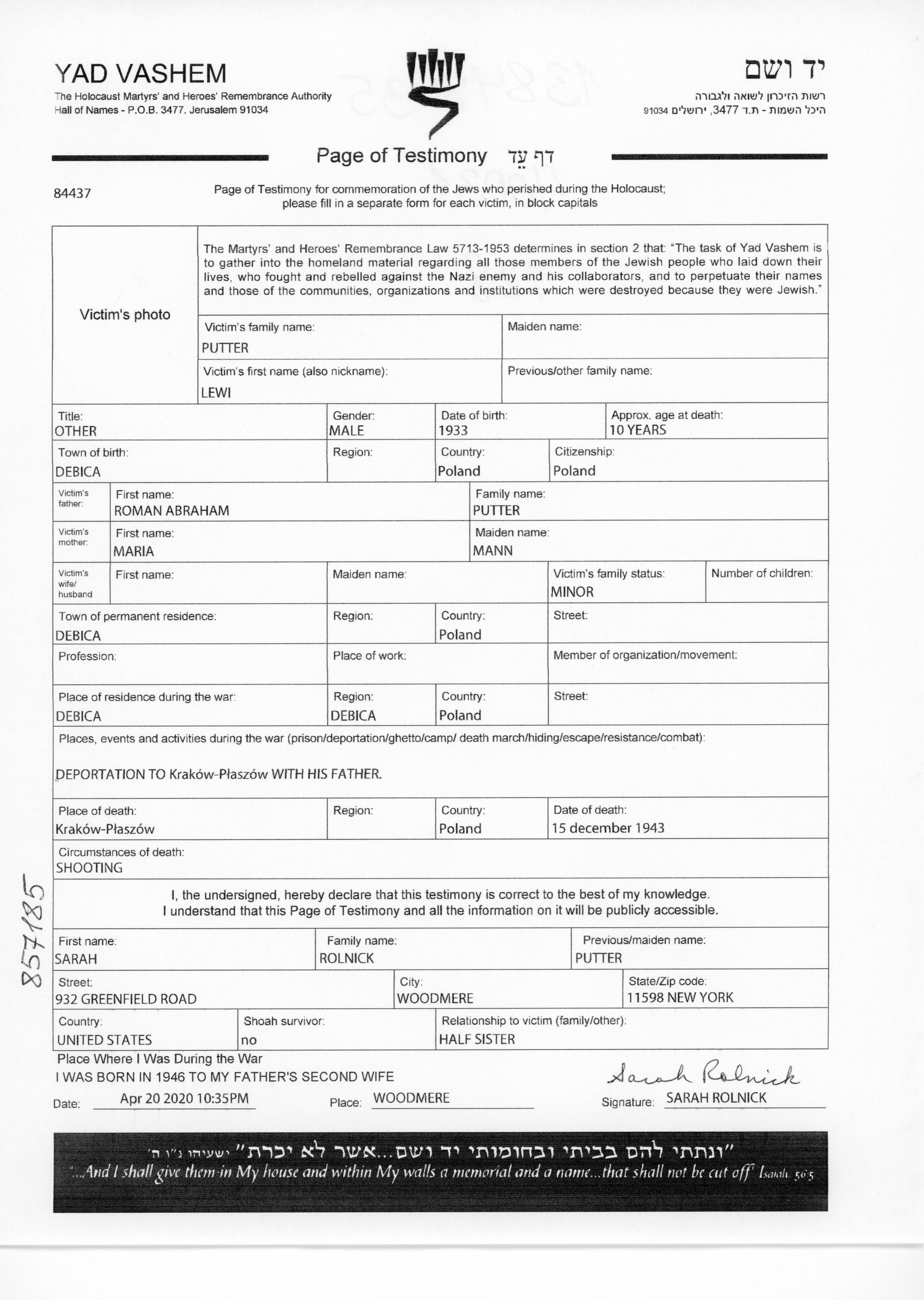 Леви Путтер, место рождения: Дембица, Польша. Место жительства до войны: Дембица, Польша. Леви уничтожен в период Шоа. место смерти: Krakau Plaszow, Польша в 15/12/1943.
