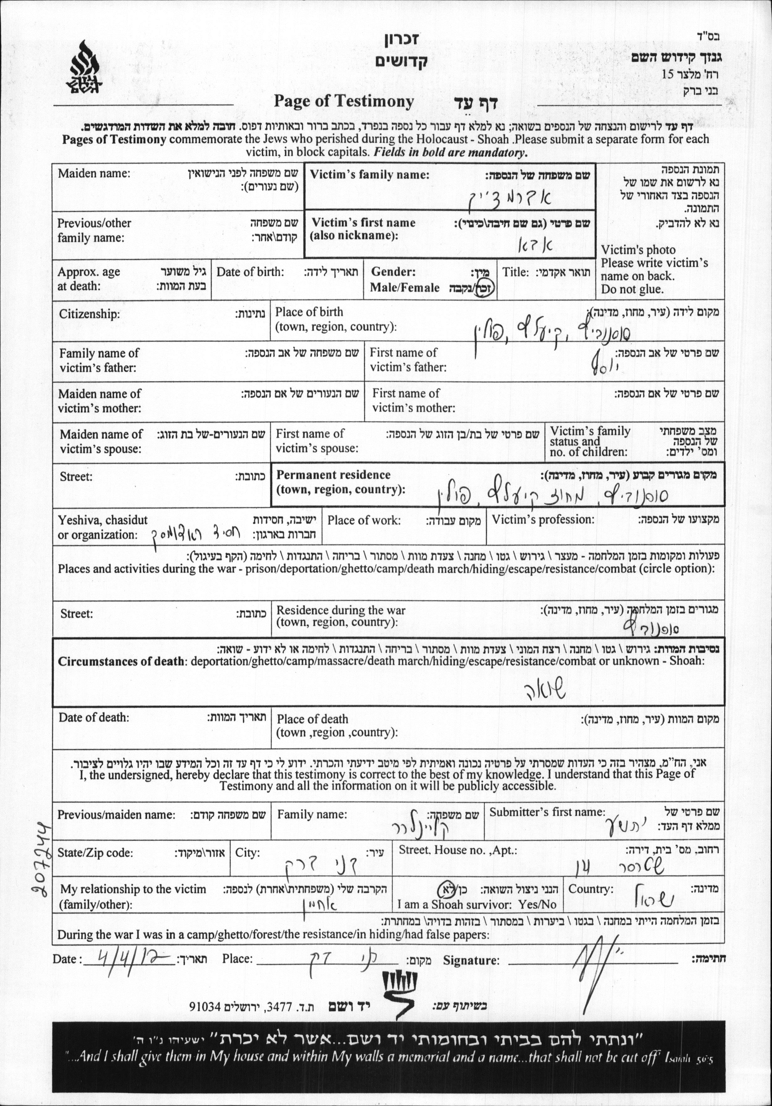 Яд Вашем - Листы свидетельских показаний Мемориального фонда