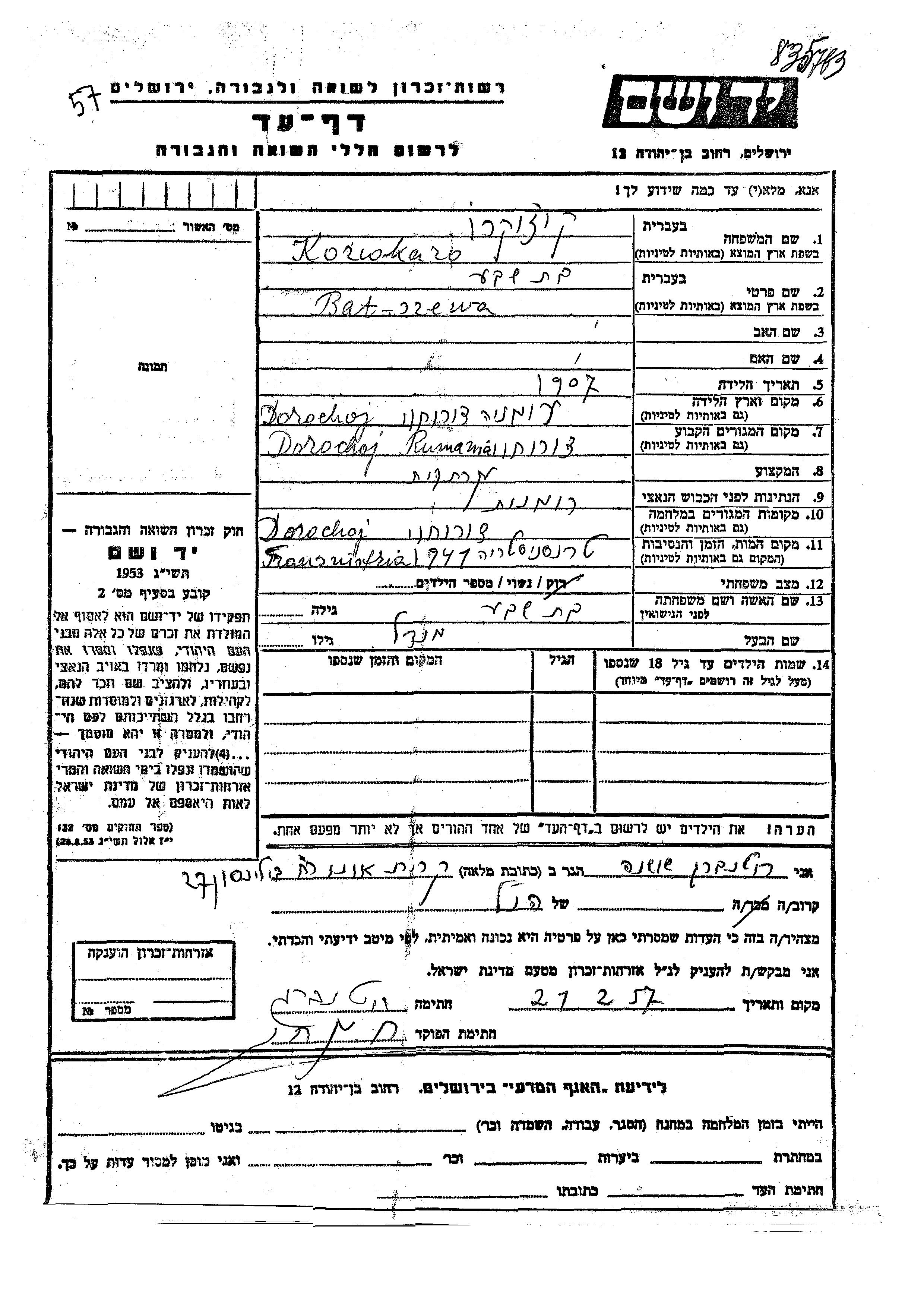 Козиокаро Батшева 1907 Дорохой, Румыния Лист свидетельских показаний