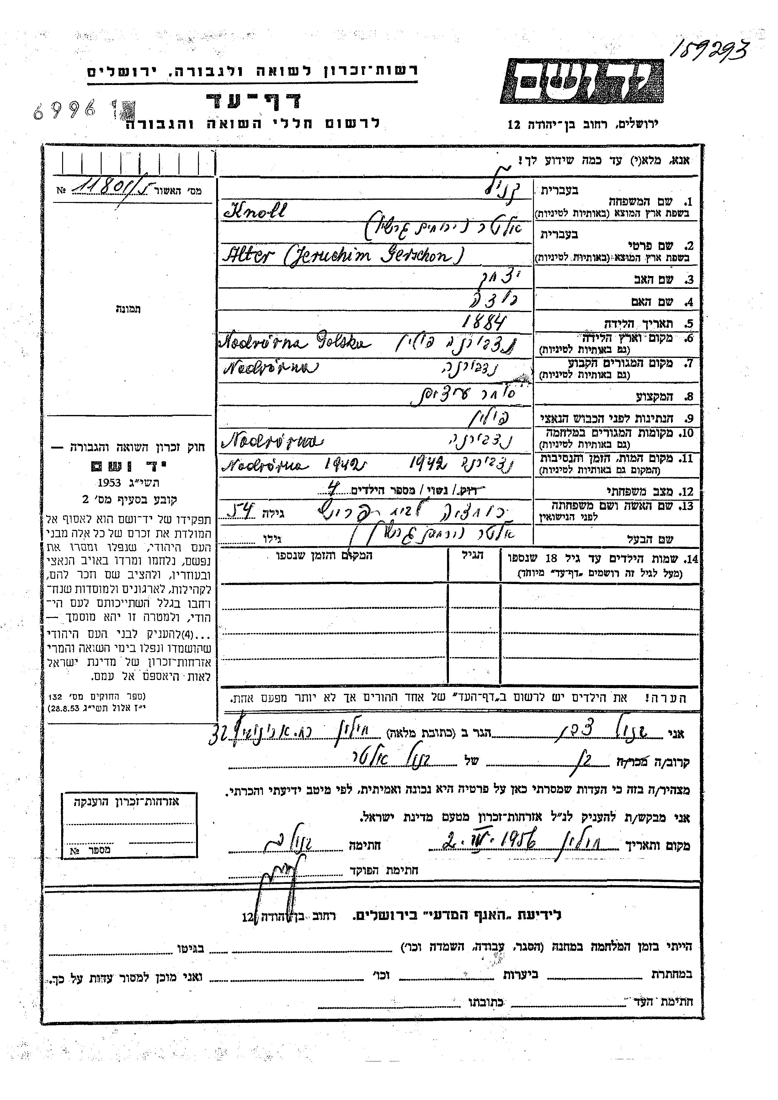Ерухим Гершон Алтер Кнолль, место рождения: Надворная, Польша. Отец: Ицхак, mать:Роза. Лесоторговец. Женат / замужем. Место жительства до войны: Надворна, Польша. Место во время войны: Надворна, Польша.