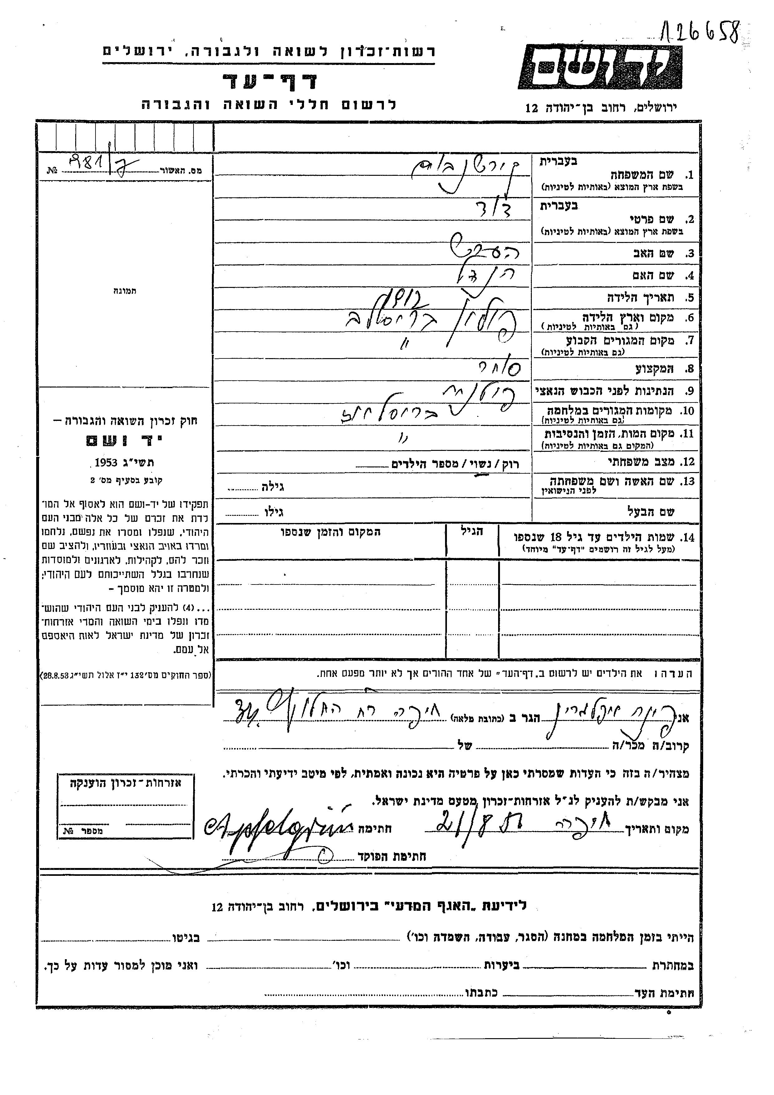 Яд Вашем - Листы свидетельских показаний Мемориального фонда