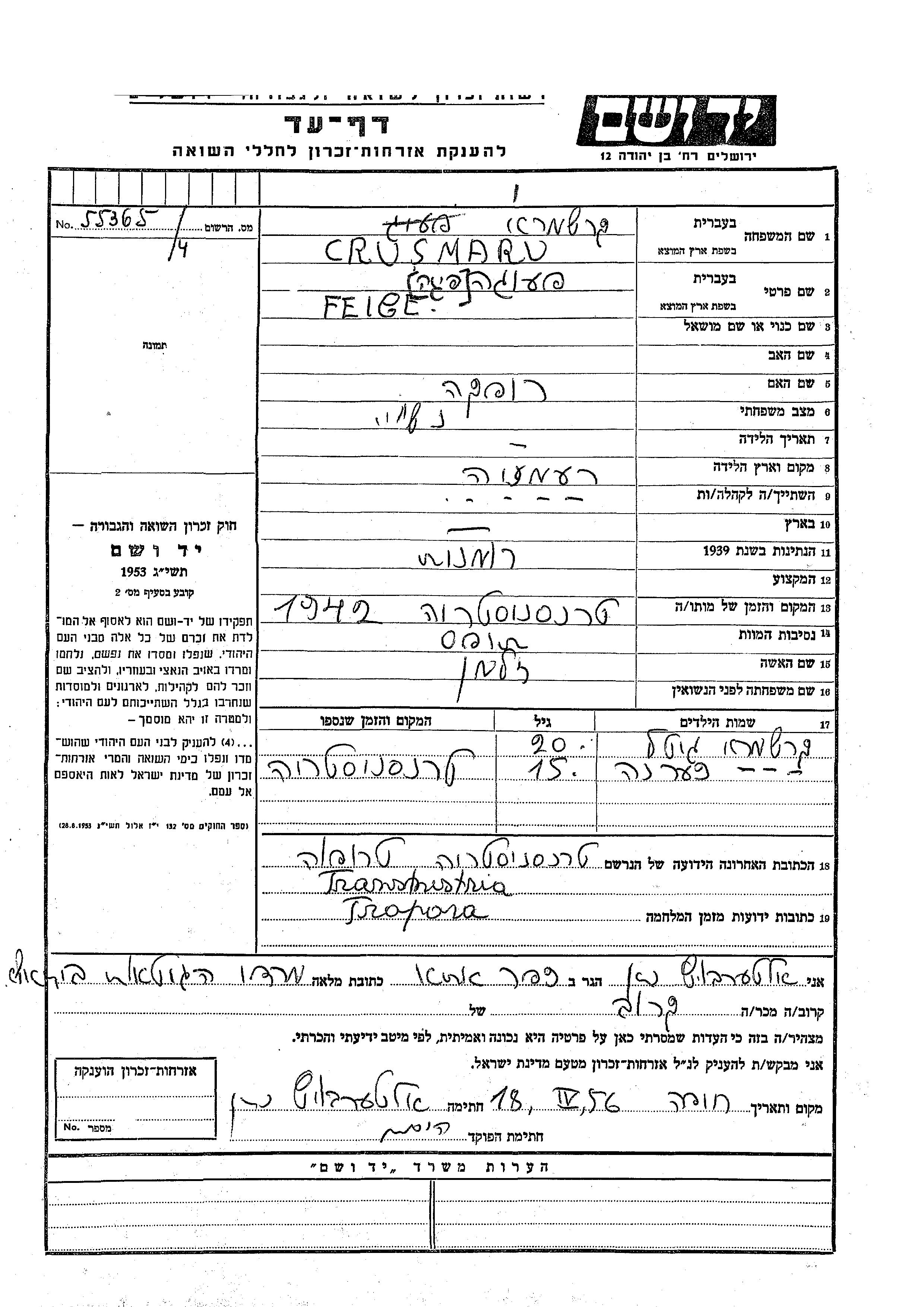 Фейга Крушмару, место рождения: Румыния.Mать:Руфка. Женат / замужем. Место жительства до войны: Троповое, Украина (СССР). Место во время войны: Троповое, Украина (СССР).