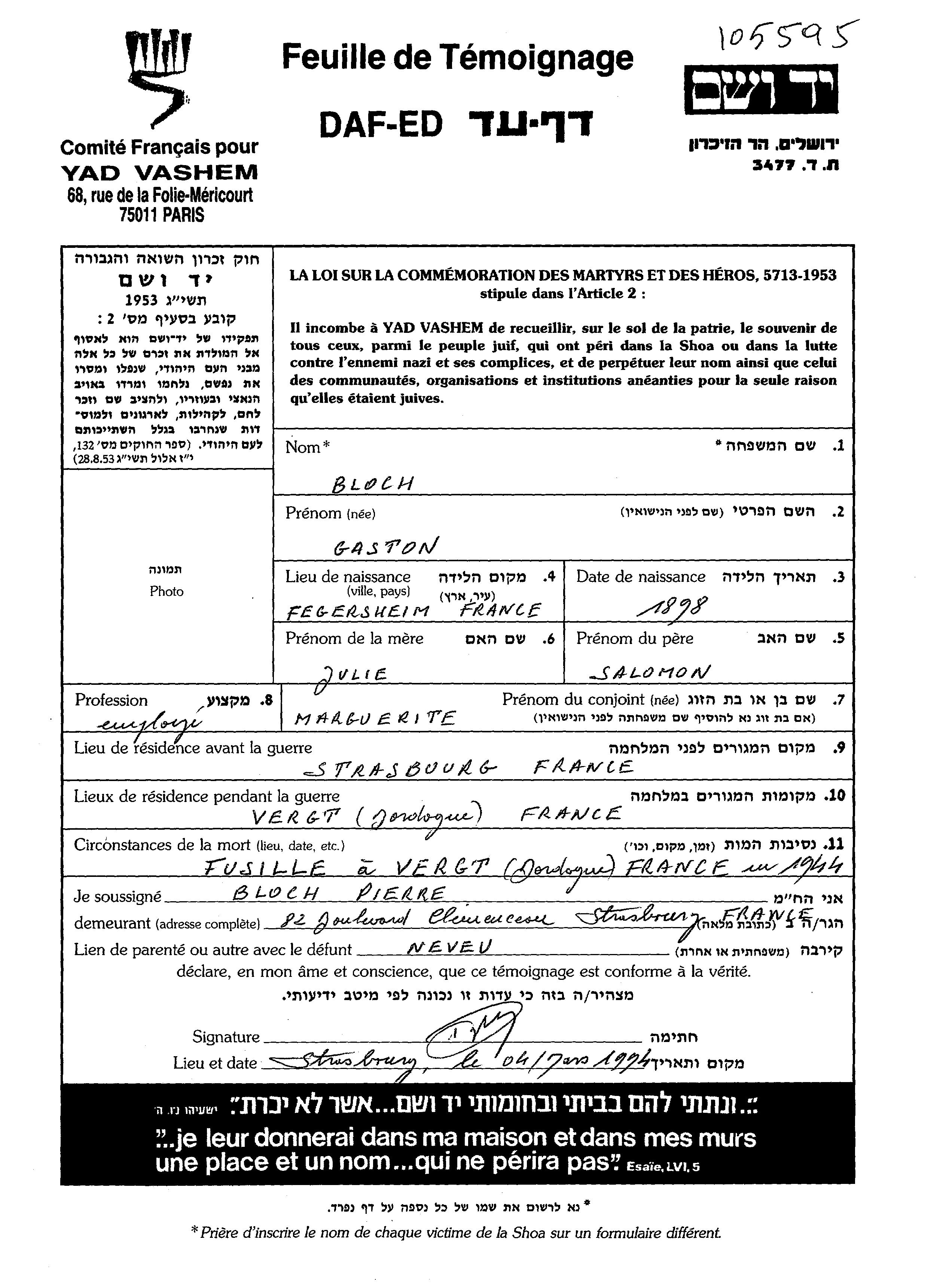 Гастон Блох, место рождения: Фежергем, Франция. Отец: Саломон, mать:Юли Золи. Клерк. Женат / замужем. Место жительства до войны: Страсбург, Франция. Место во время войны: Вер, Франция.