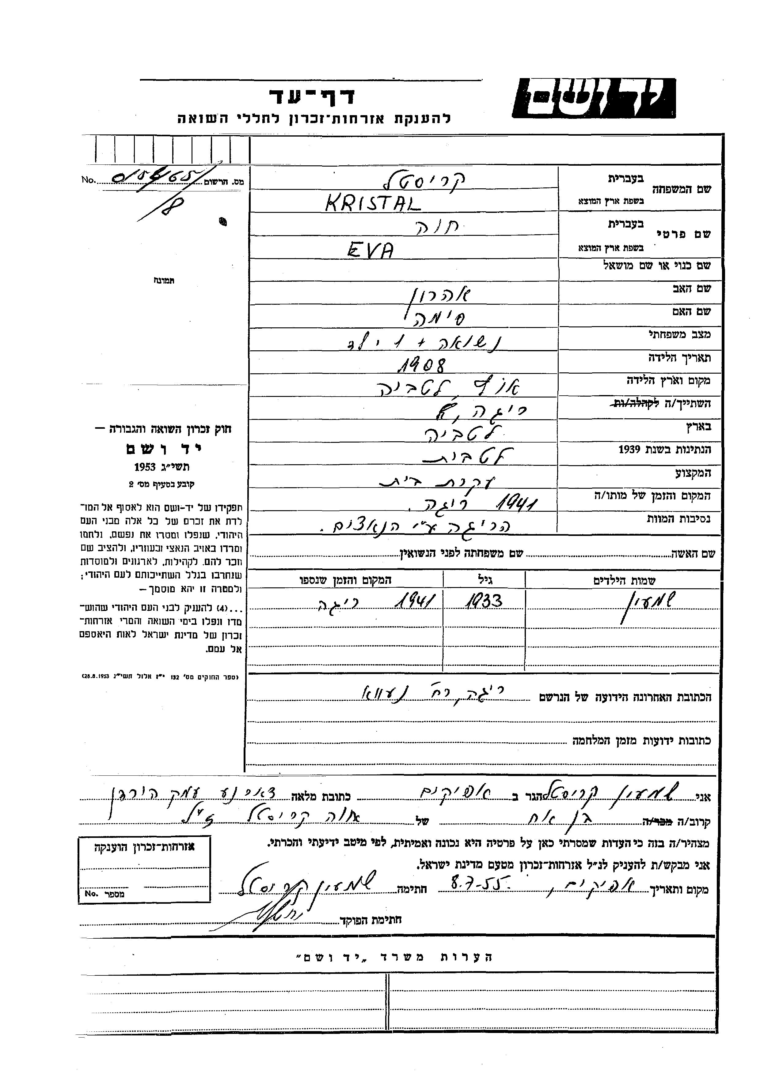 Эва Хава Кристаль, место рождения: Ауче, Латвия. Отец: Арон, mать:Сима. Домохозяйка. Женат / замужем. Место во время войны: Рига, Латвия.