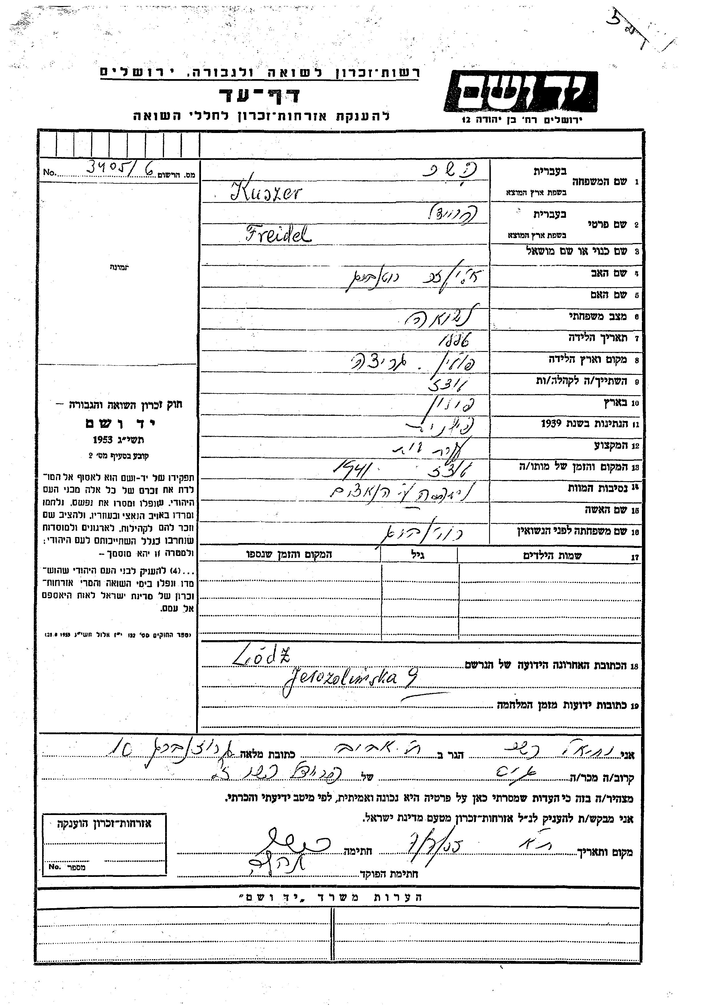 Фрейдель Фрейдел Кушер, девичья фамилия Рутенберг, место рождения: Груец, Польша. Отец: Элиэзер. Домохозяйка. Женат / замужем. Место жительства до войны: Лодзь, Польша. Место во время войны: Лодзь, Польша.