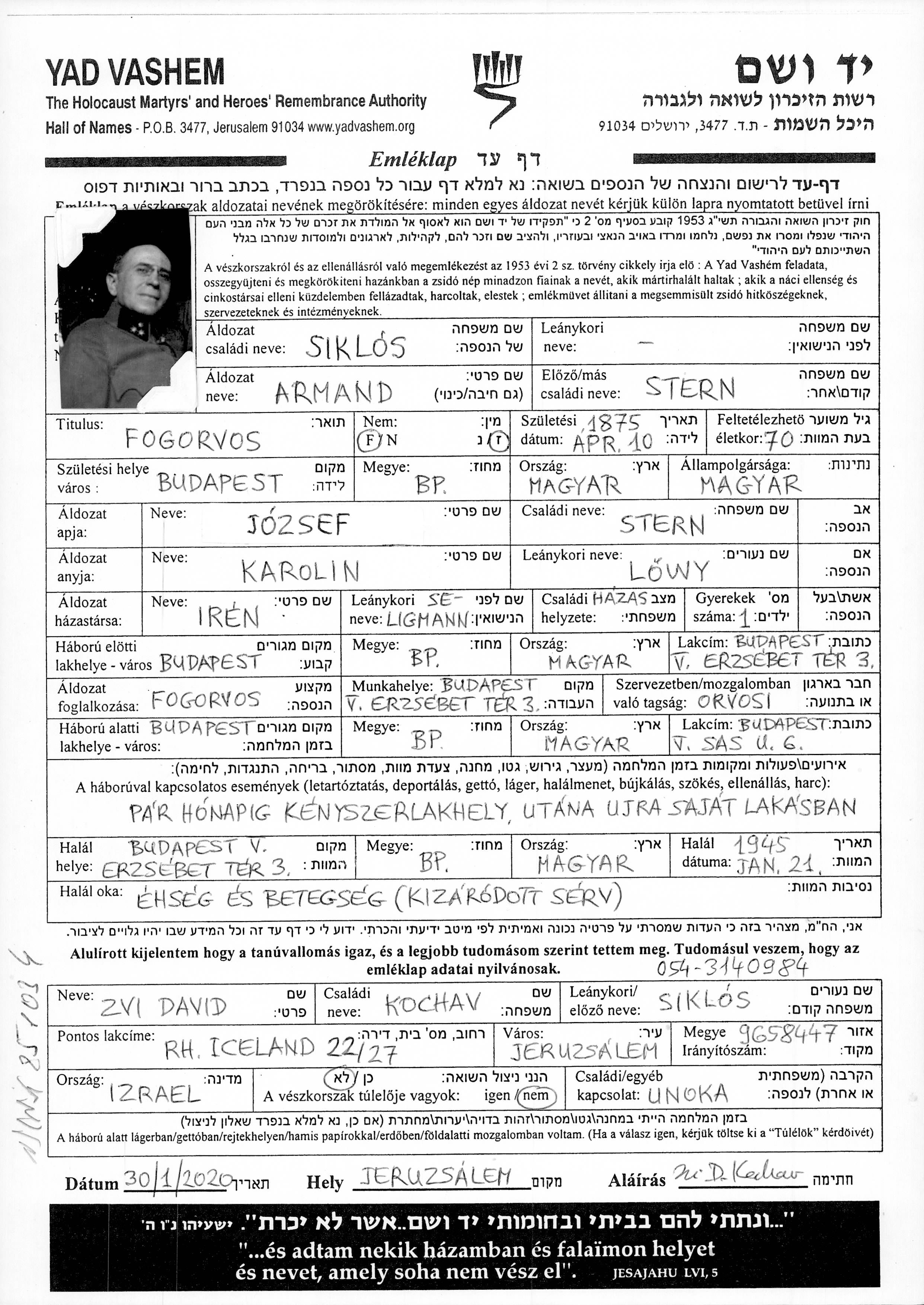 Арманд Шиклош, место рождения: Будапешт, Венгрия. Зубной врач. Место жительства до войны: Будапешт, Венгрия.