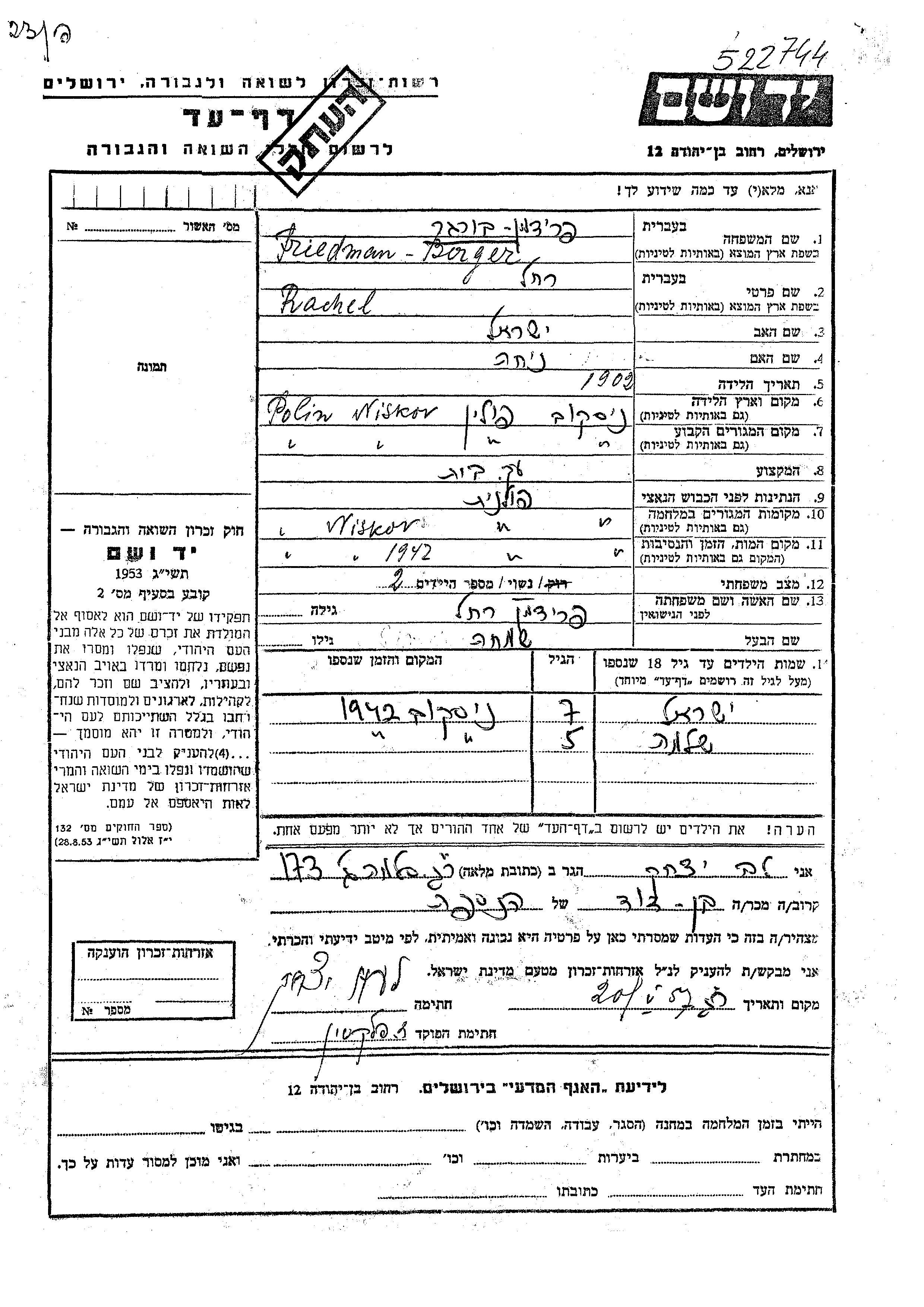 Бургер | Рахель | 1902 | Ниско, Польша | Лист свидетельских показаний |