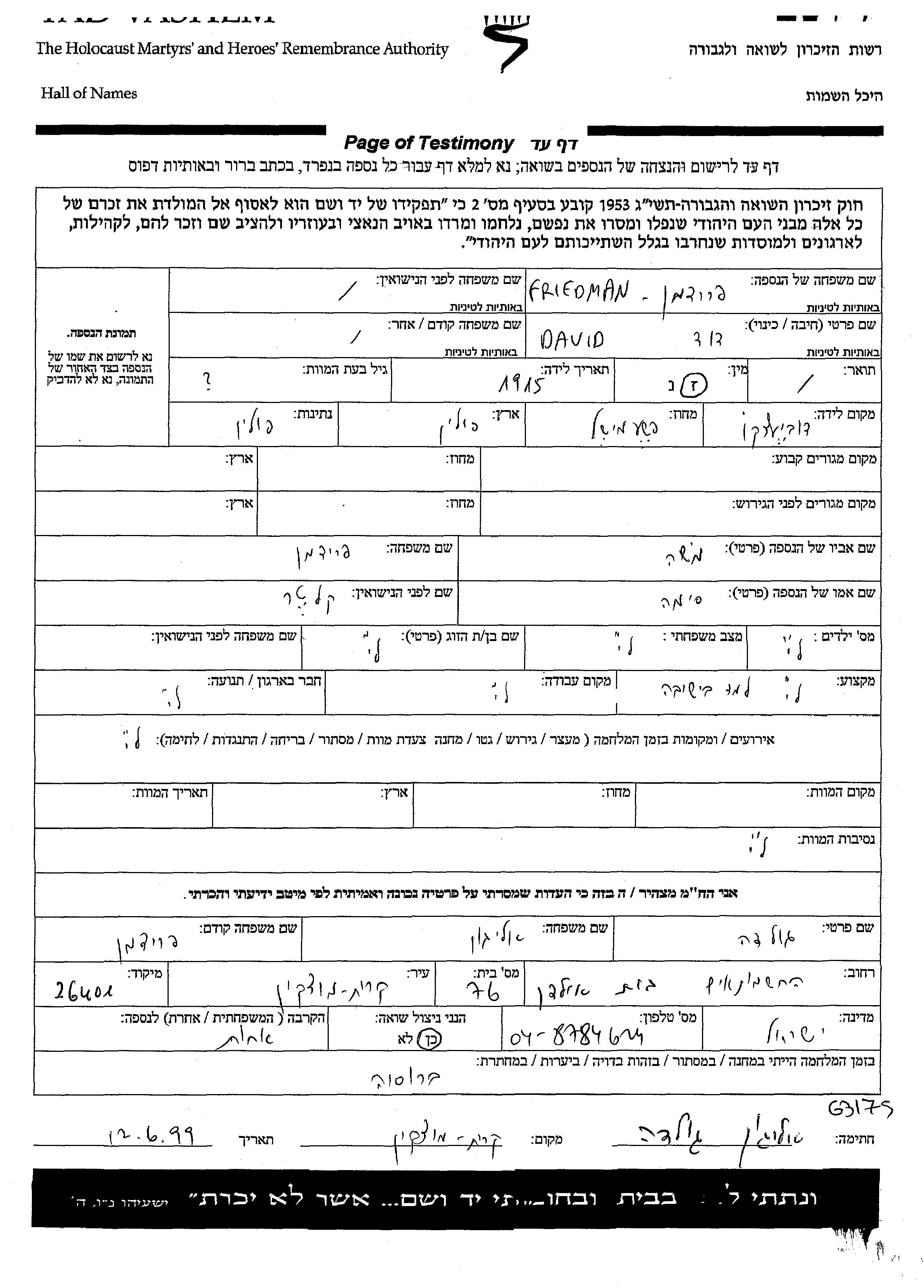 פריעידמאן Давид Дубецко, Польша Лист свидетельских показаний