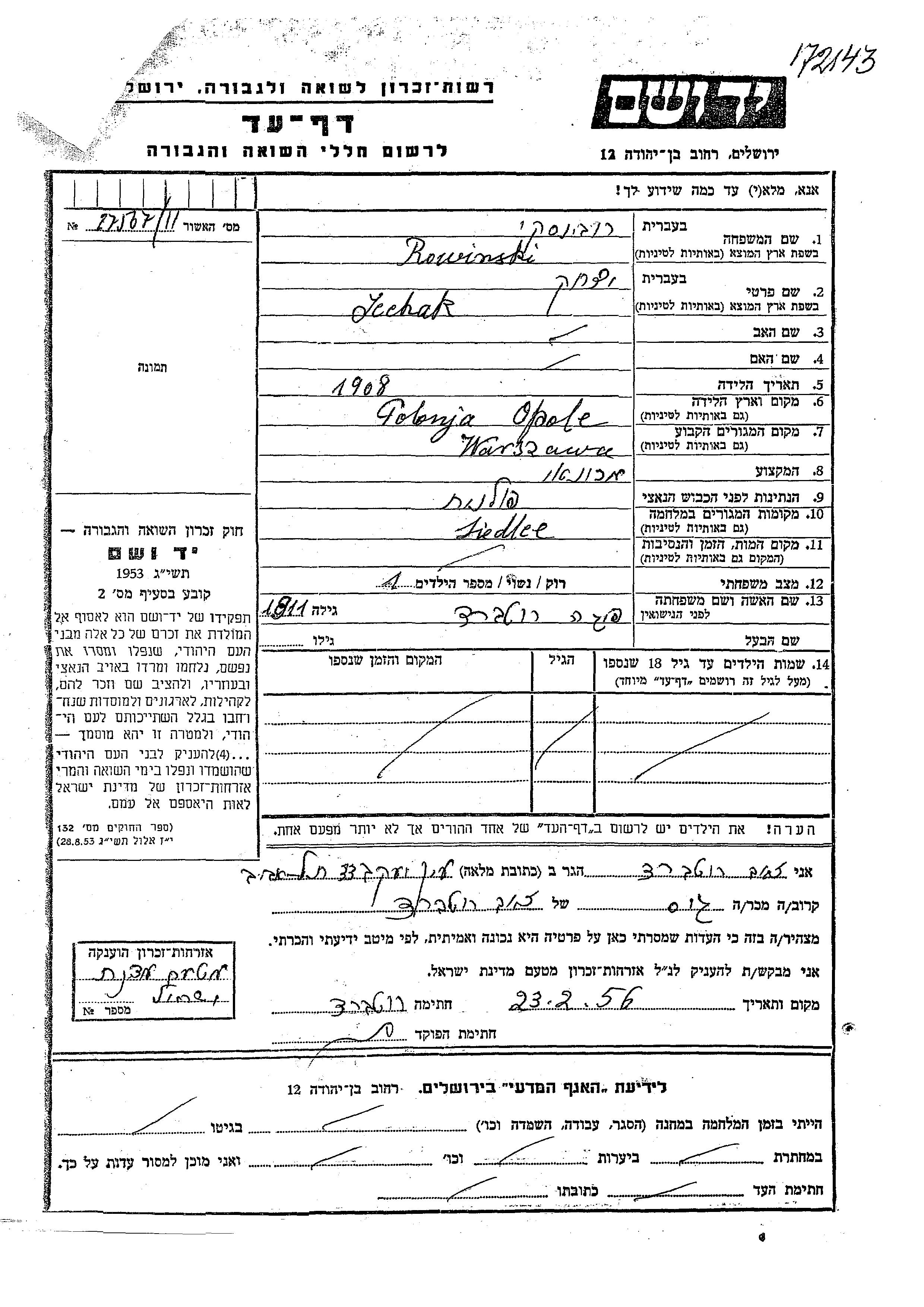 Ицхак Ровински Рубински, место рождения: Ополе, Польша. Механик. Женат / замужем. Место жительства до войны: Варшава, Польша. Место во время войны: Седльце, Польша.
