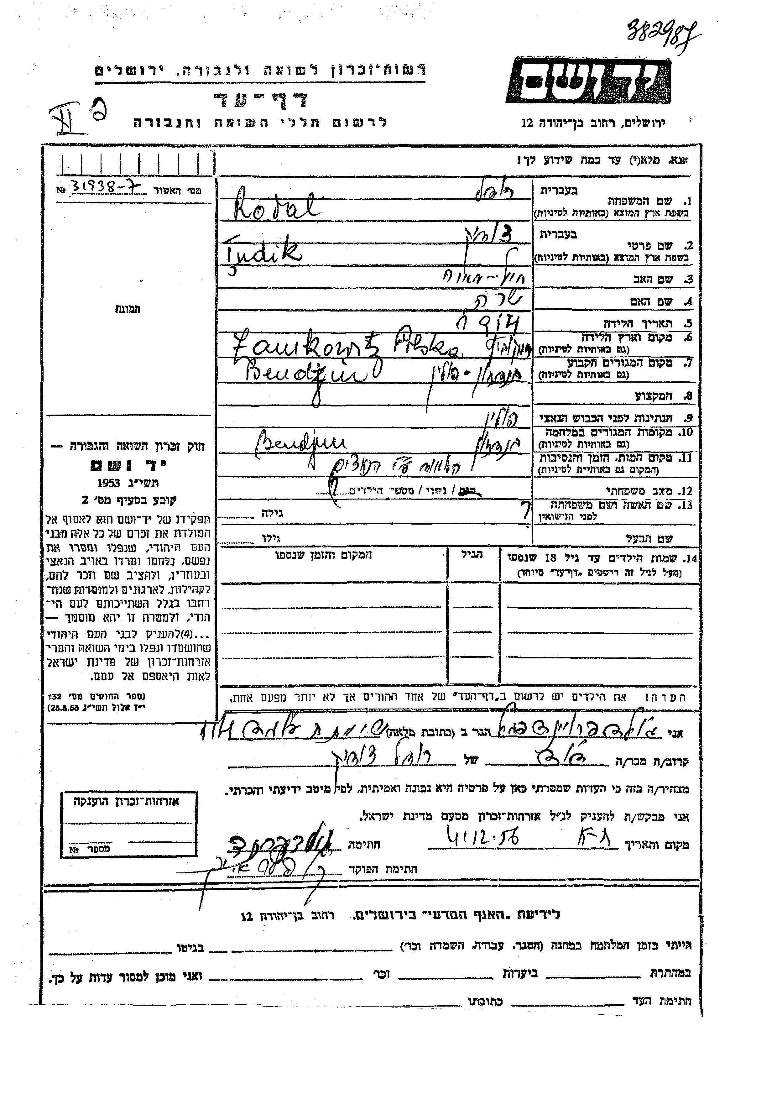 Родаль Рубель Цудик 1914 Бендзин, Польша Лист свидетельских показаний