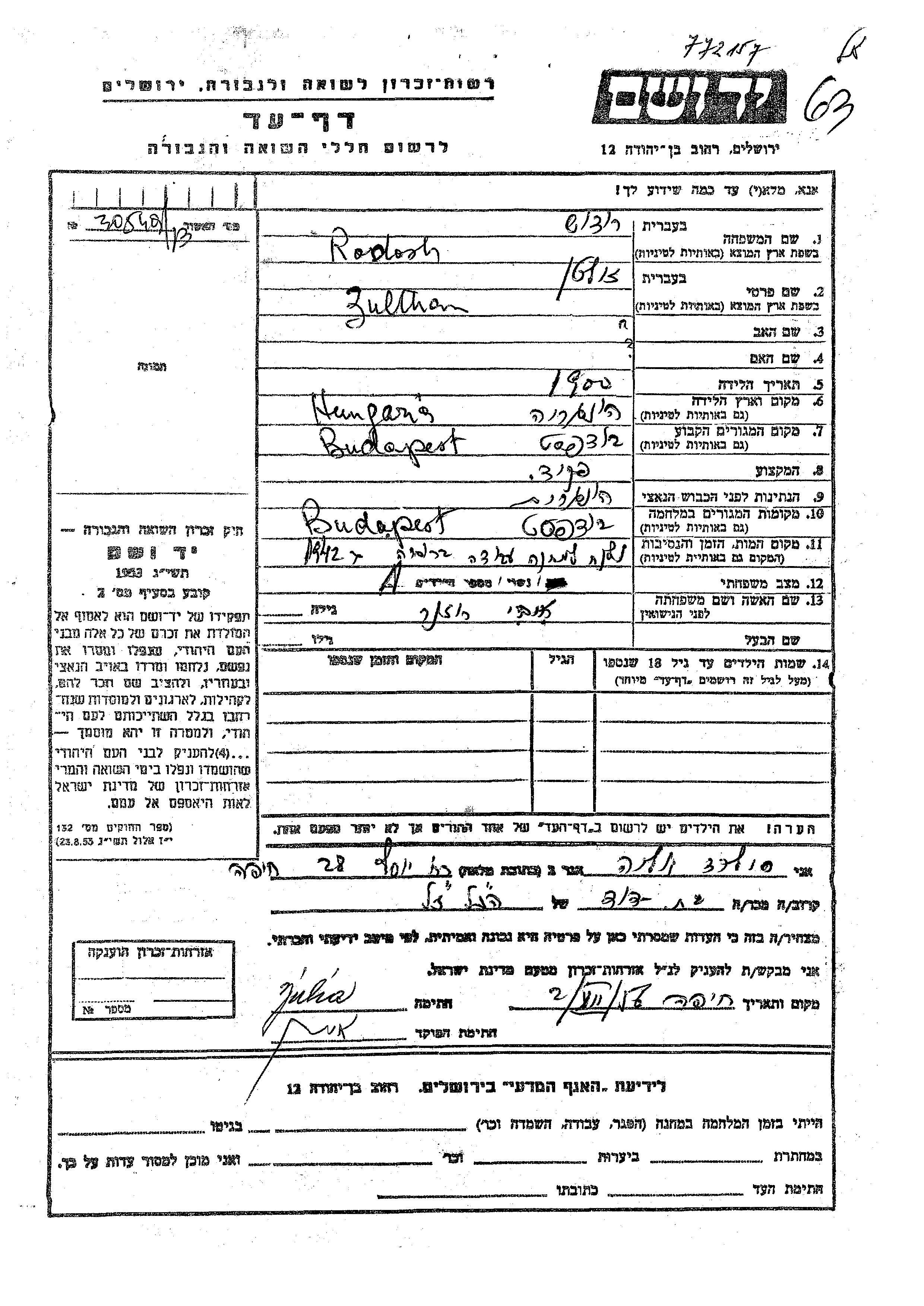 Зултан Родош, место рождения: Венгрия. Клерк. Женат / замужем. Место жительства до войны: Будапешт, Венгрия. Место во время войны: Будапешт, Венгрия.
