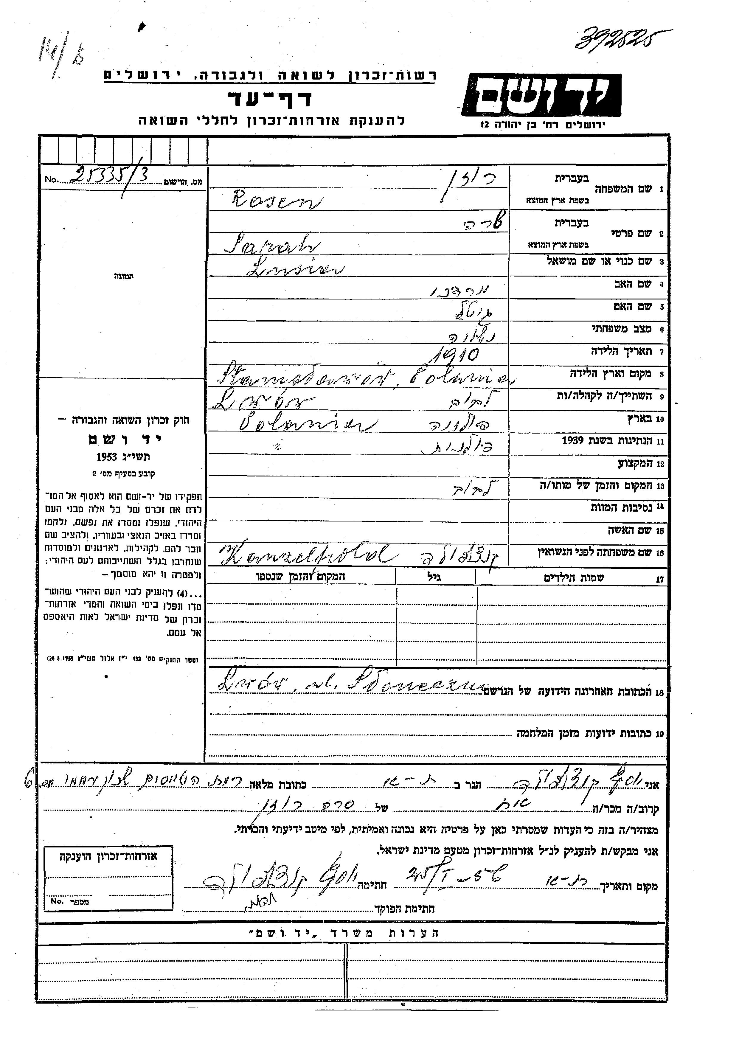 Розен Сара 1910 Львов, Польша Лист свидетельских показаний
