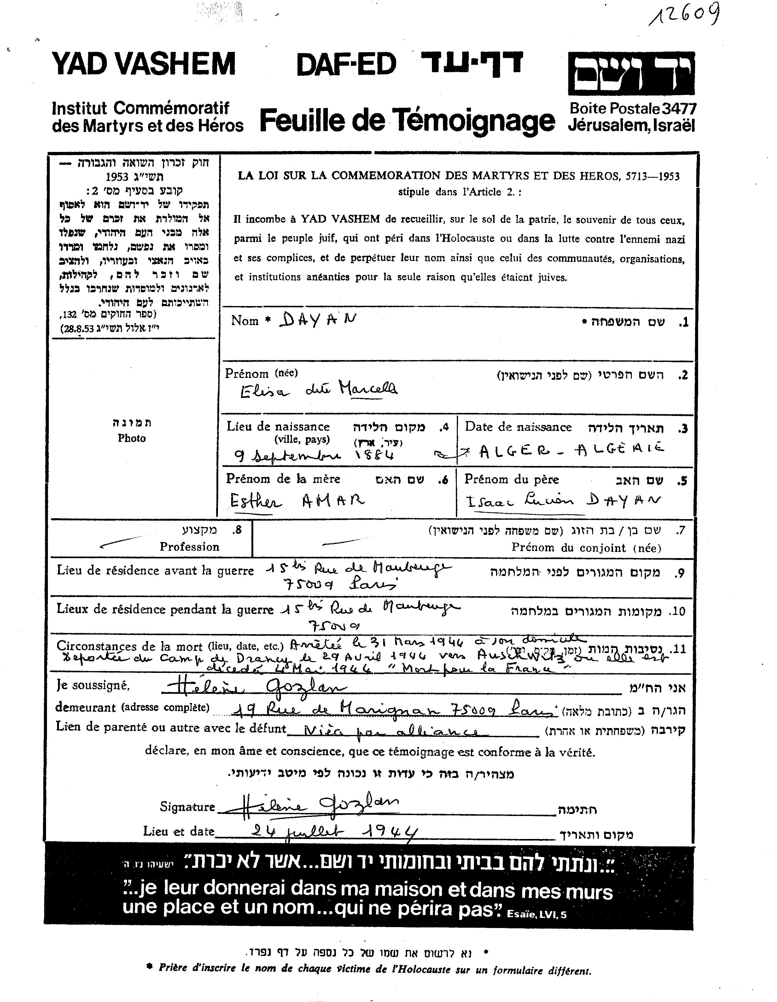 Элиса Марсель Даян, место рождения: Алжир, Алжир. Место жительства до войны: Париж, Франция.