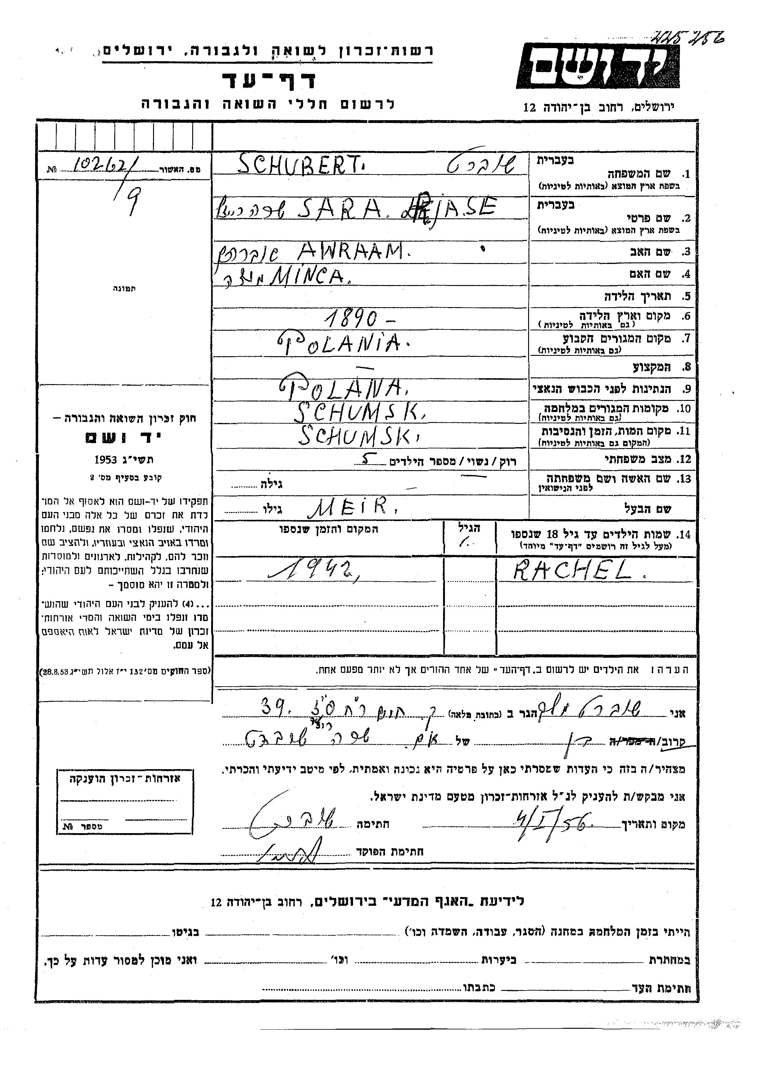 Райзе Сара Шуберт, место рождения: Польша. Отец: Авраам, mать:Минка. Женат / замужем. Место жительства до войны: Польша. Место во время войны: Шумск, Польша.