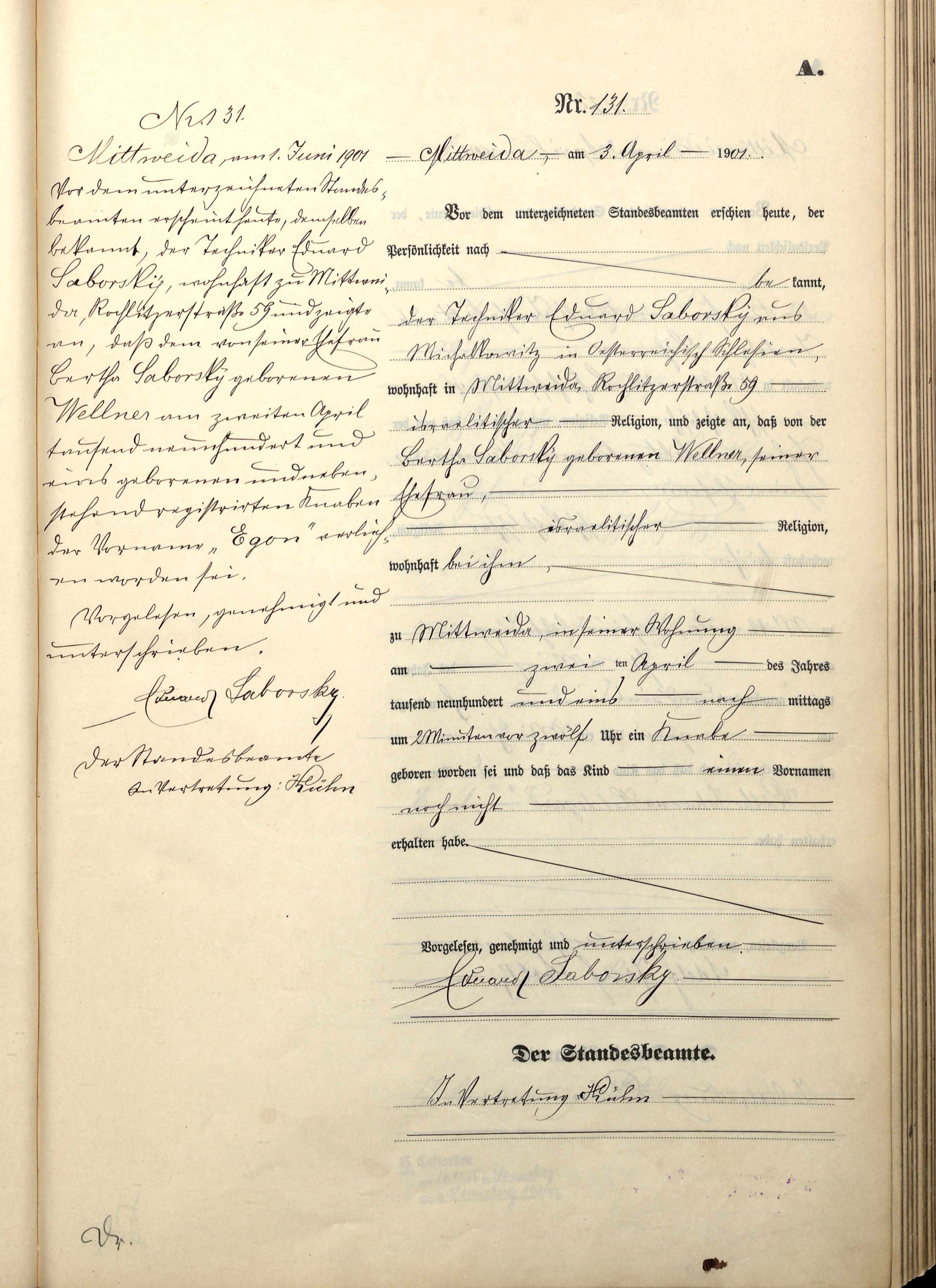 Саборски Эгон 1901 Миттвейда, Германия Birth certificate