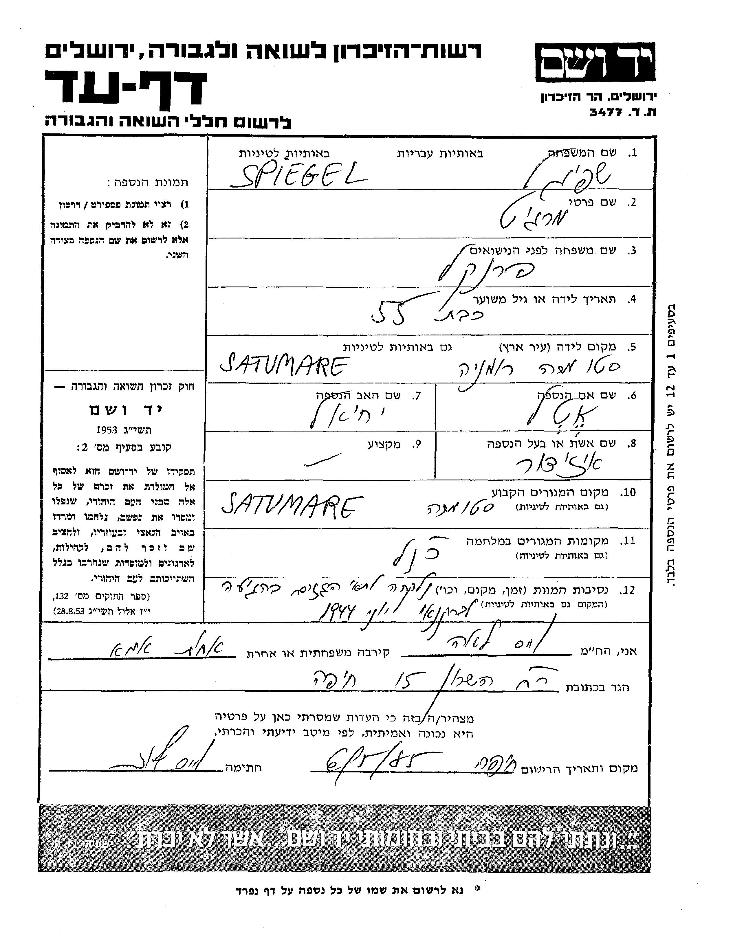 Шпигель Мирьям 1884 Сатомаре, Румыния Лист свидетельских показаний