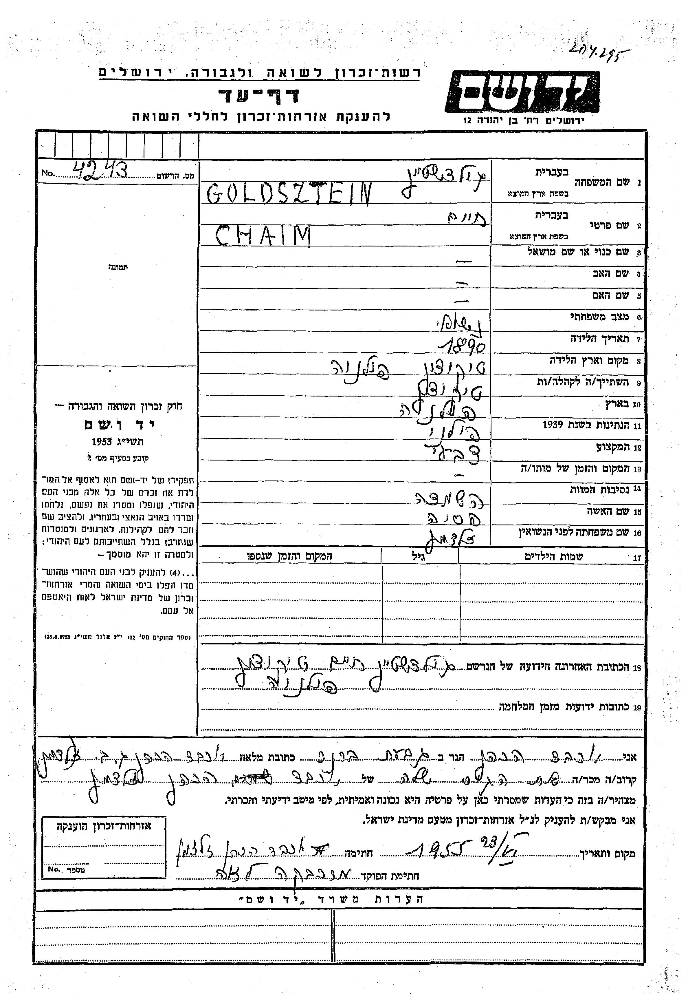 Гольдштейн Хаим 1890 место не указано, Лист свидетельских показаний