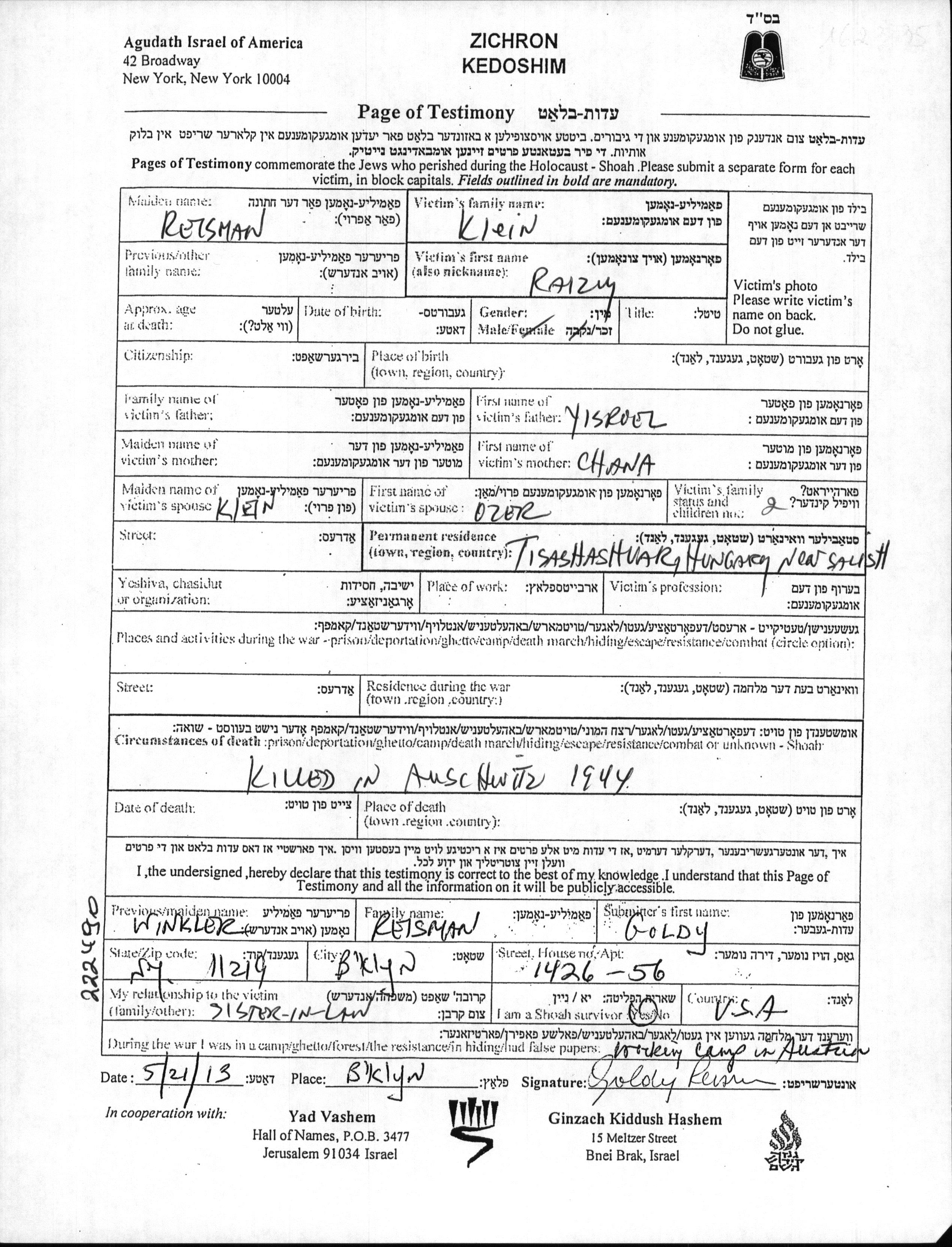 Ружа Кляйн, девичья фамилия Райсман, место рождения: Шашвар, Чехословакия. Место жительства до войны: Севлюш, Чехословакия.