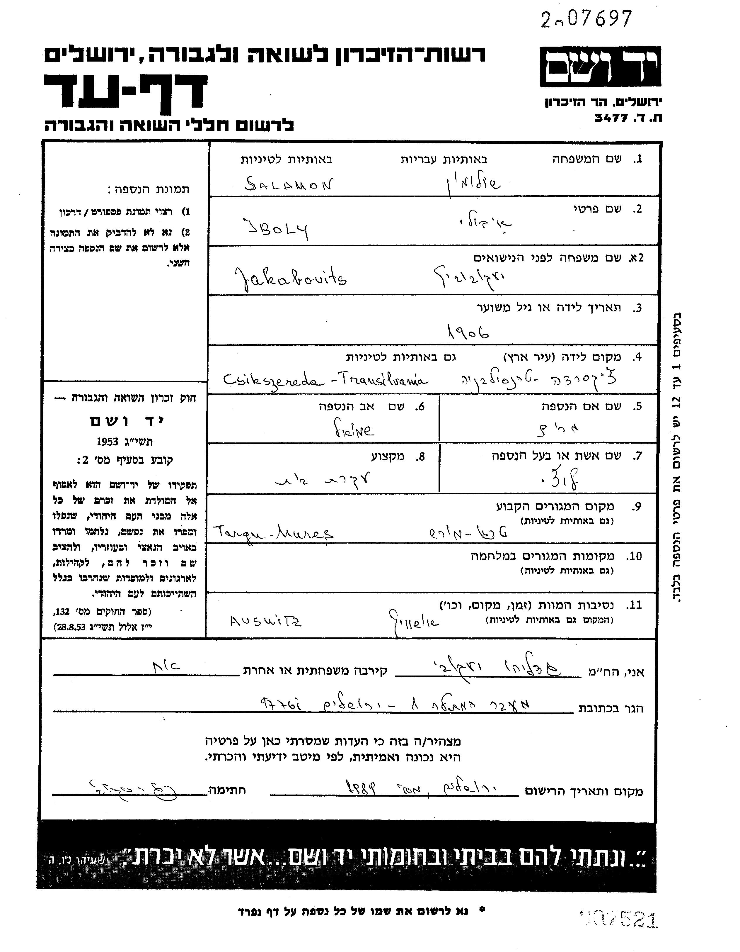 Саламон Ибой 1906 Тыргу-Муреш, Румыния Лист свидетельских показаний