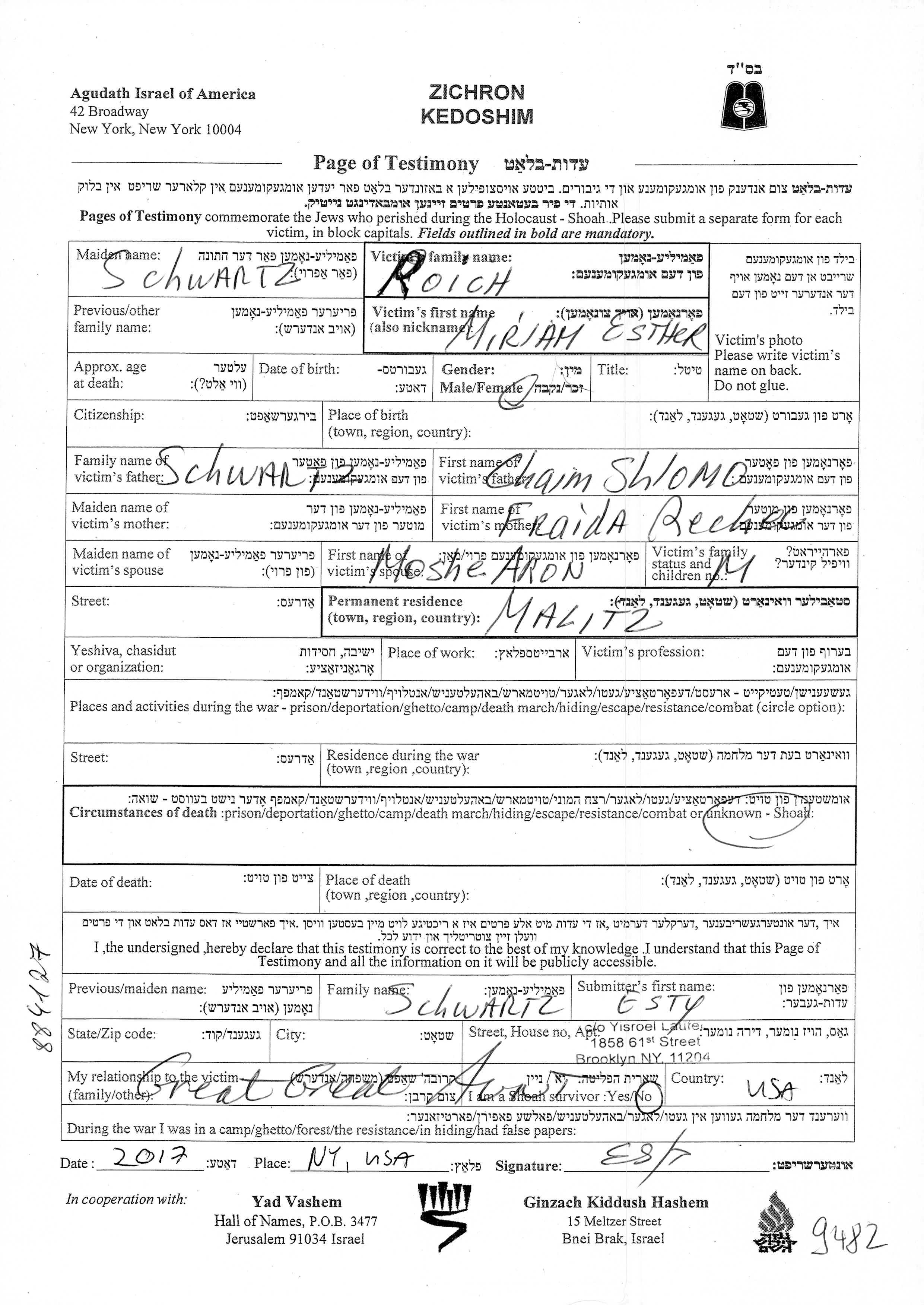 Мириам Эстер Ройх, девичья фамилия Шварц Хаим Шломо Фрайда Рехель. Женат / замужем. Место жительства до войны: Малеч, Польша.