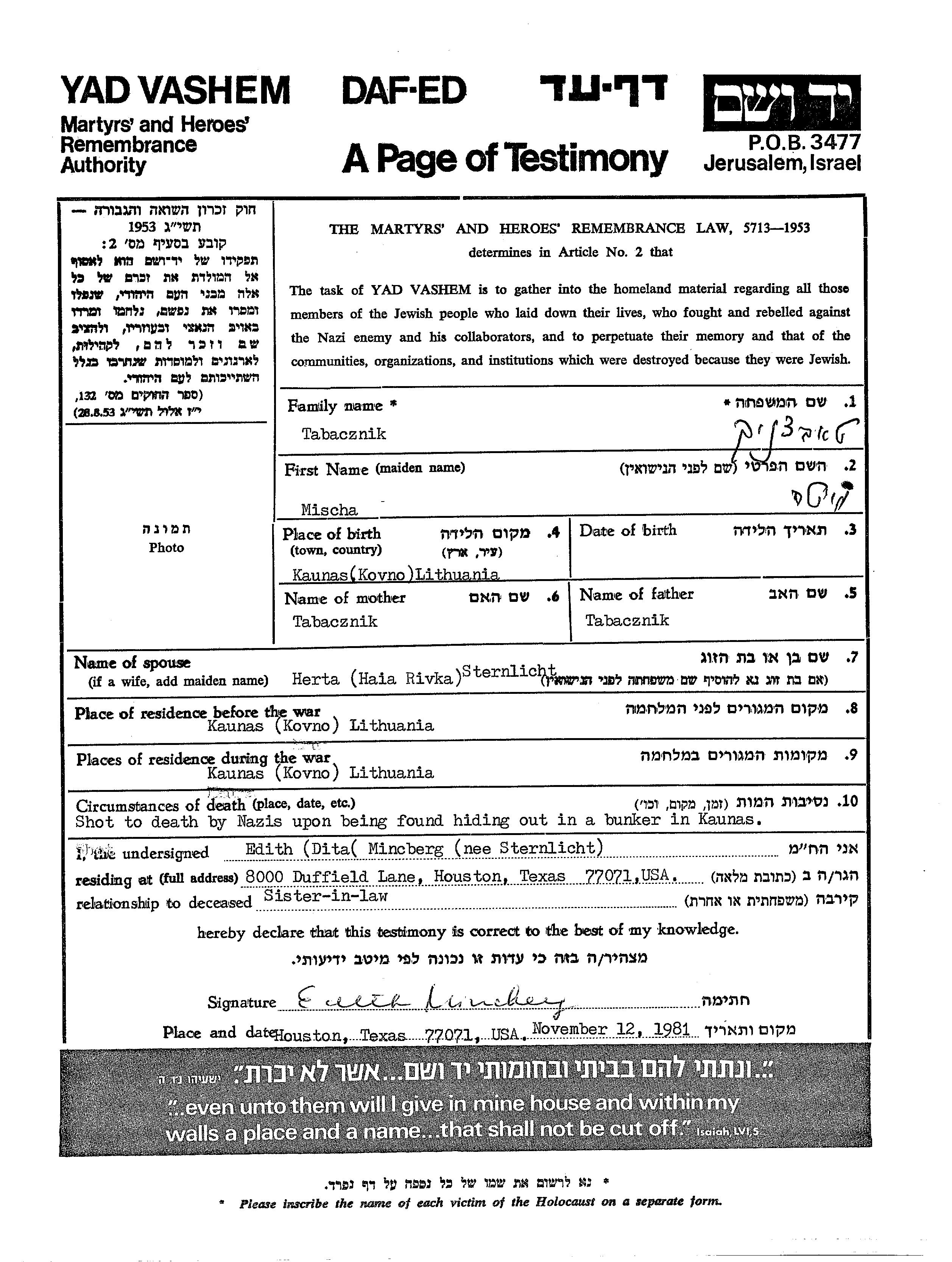 Табачник Миша Каунас, Литва Лист свидетельских показаний
