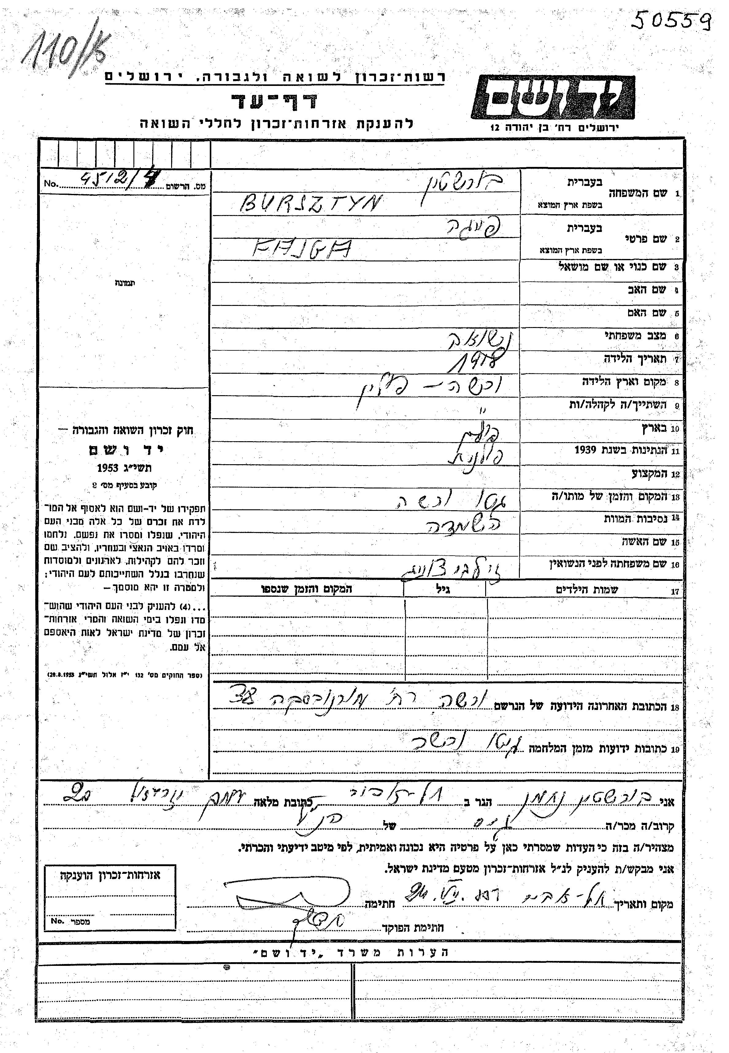 Файга Бурштин, девичья фамилия Зильберцвейг, место рождения: Варшава, Польша. Женат / замужем. Место жительства до войны: Варшава, Польша.