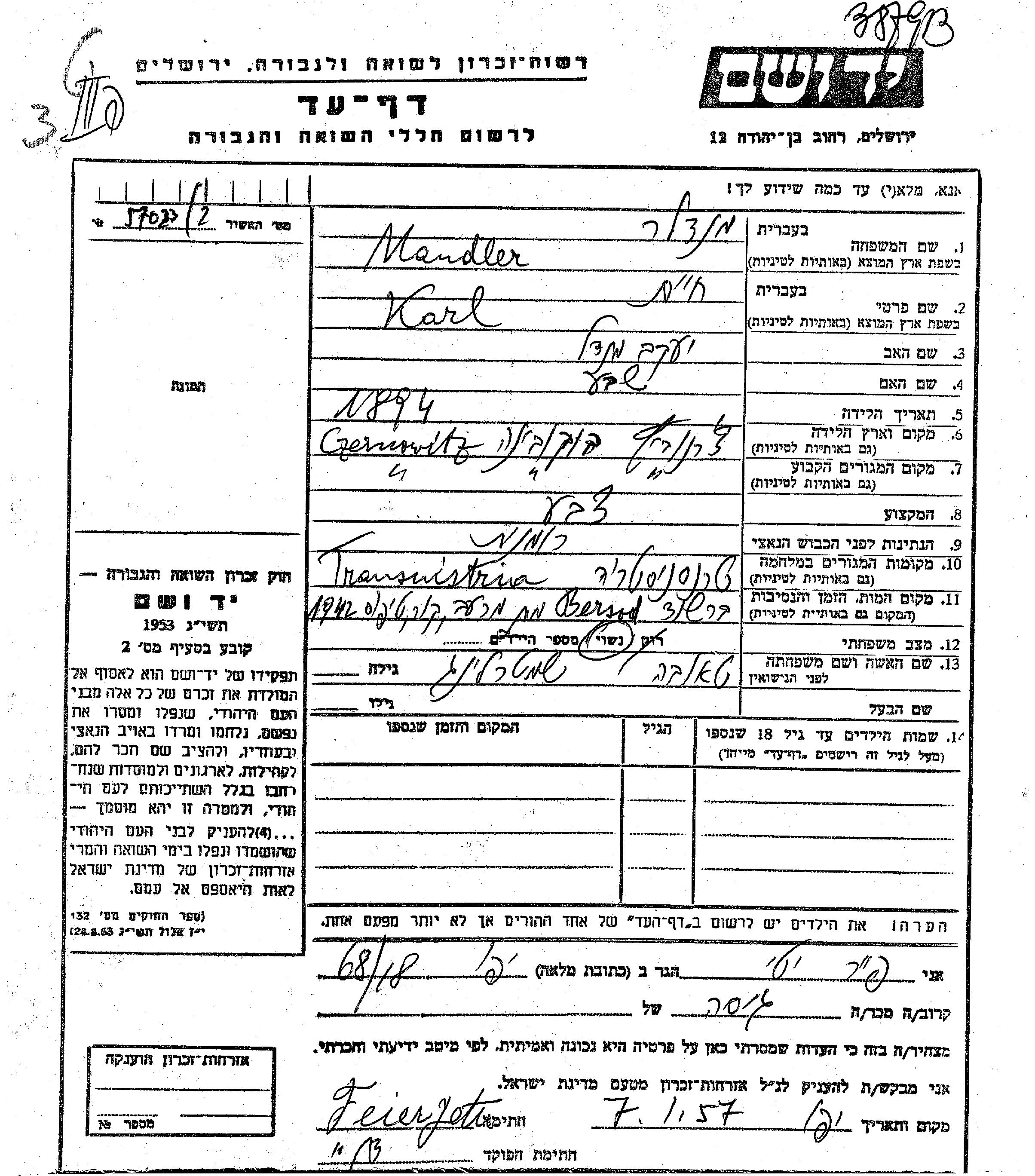 Карл Хаим Мандлер, место рождения: Черновцы, Румыния. Отец: Яков Мендель, mать:Шева. Маляр. Женат / замужем. Место жительства до войны: Черновцы, Румыния. Место во время войны: Транснистрия, Украина (СССР).