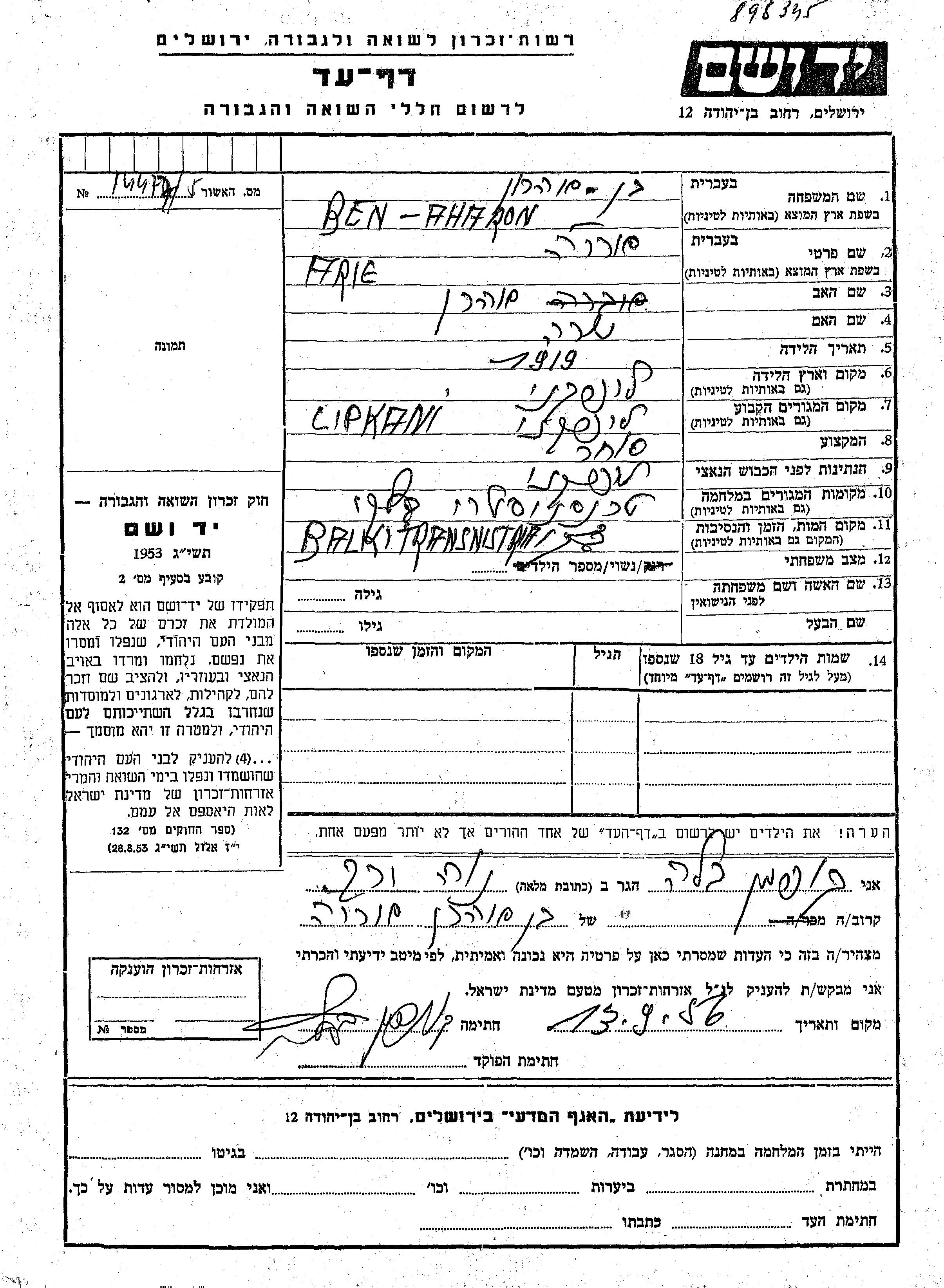 Бен Аарон Арье 1919 Липкань, Румыния Лист свидетельских показаний
