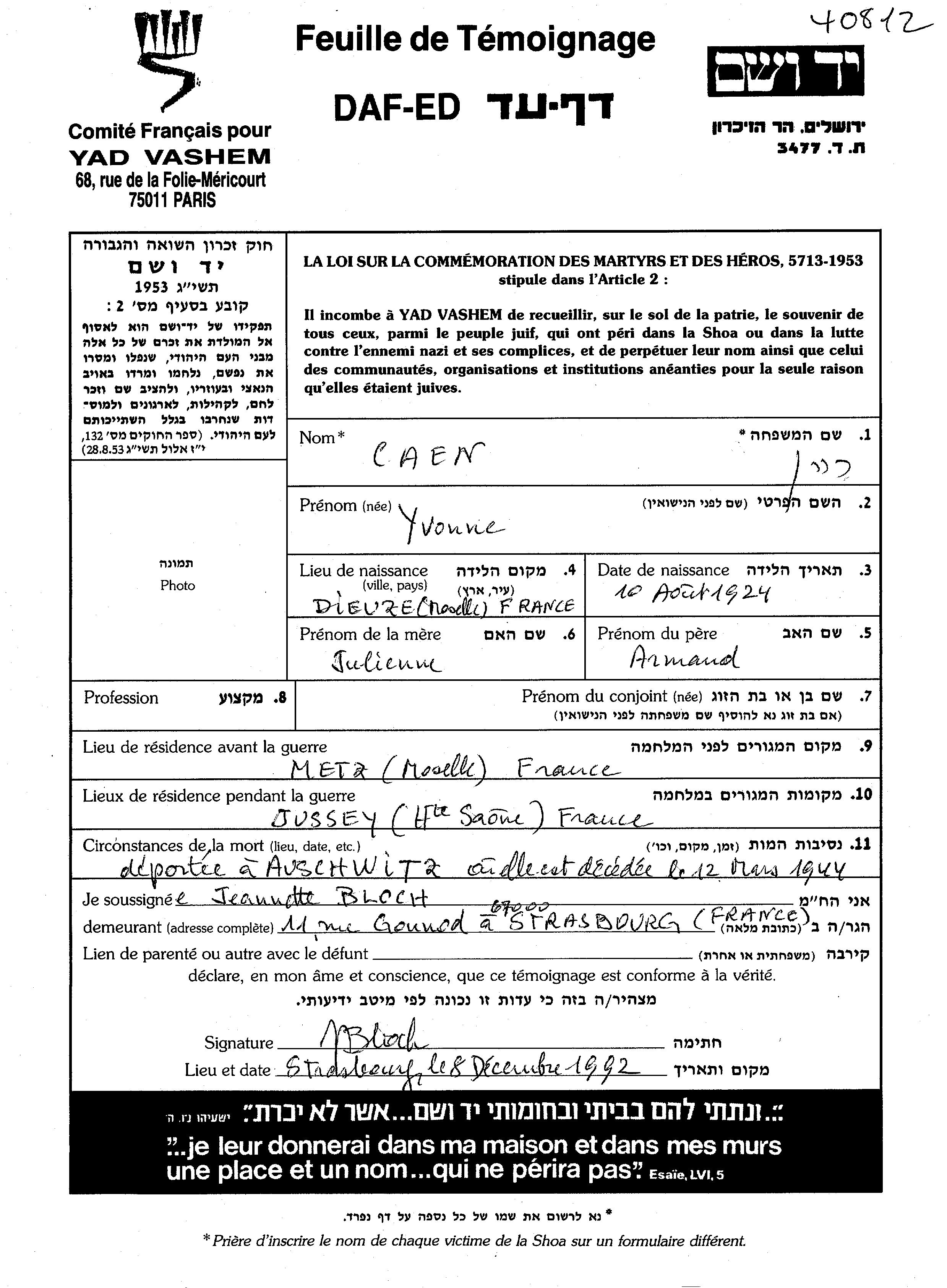 Ивон уничтоженa в период Шоа. место смерти: Аушвиц, Польша в 12/03/1944.