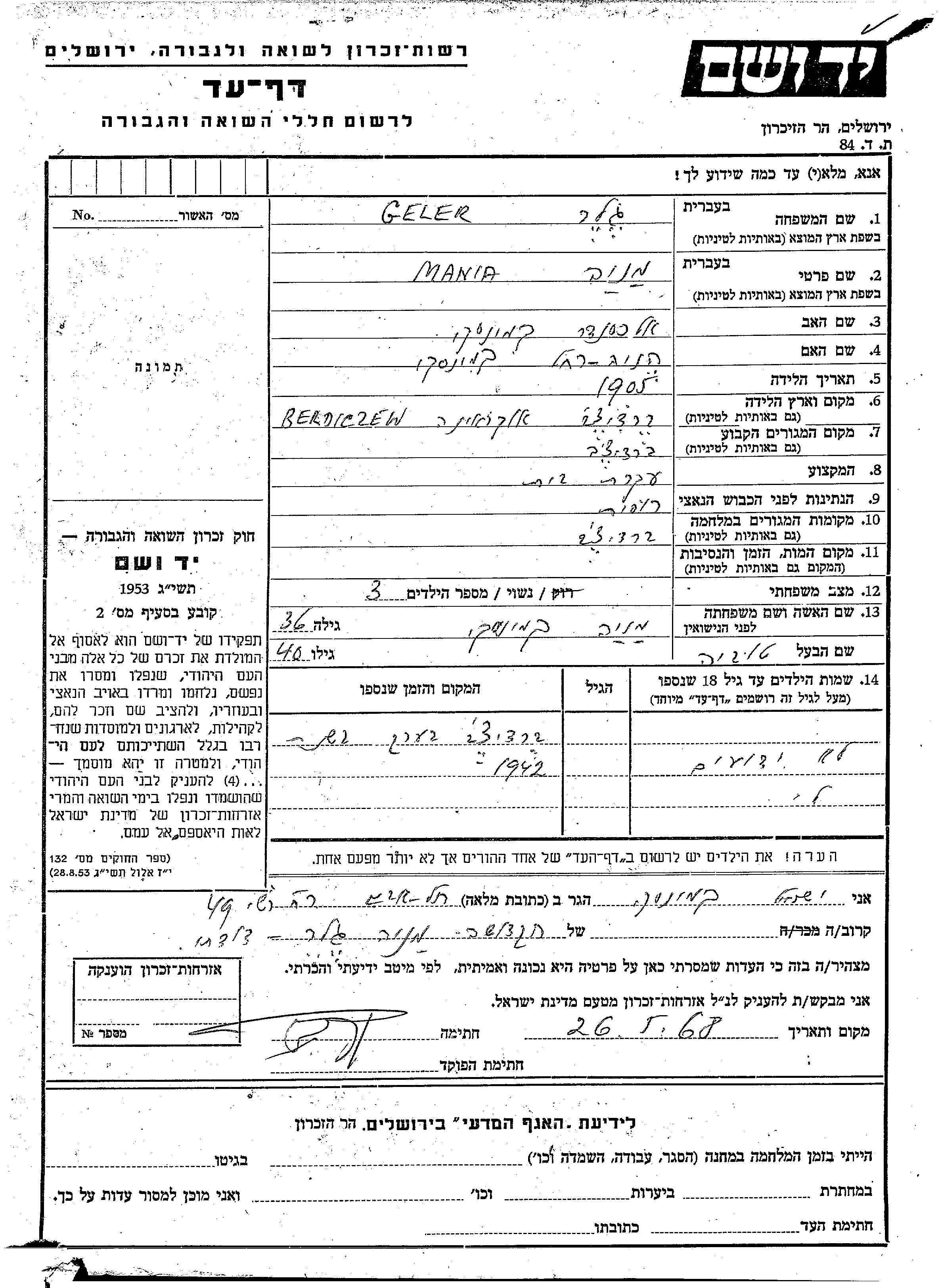 Маня Гелер, девичья фамилия Камински, место рождения: Бердичев, Украина (СССР). Отец: Александер, mать:Хеня Рахель. Домохозяйка. Женат / замужем. Место жительства до войны: Бердичев, Украина (СССР). Место во время войны: Бердичев, Украина (СССР).