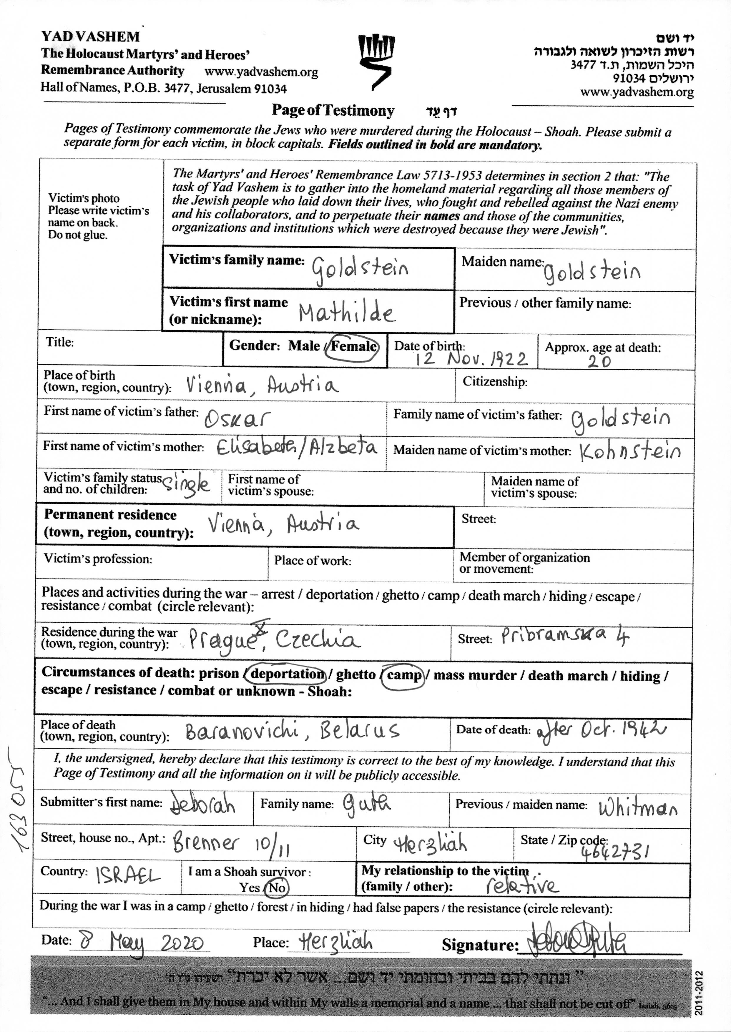 Матильда Гольдштайнова, место рождения: Вена, Австрия. Место жительства до войны: Вена, Австрия.
