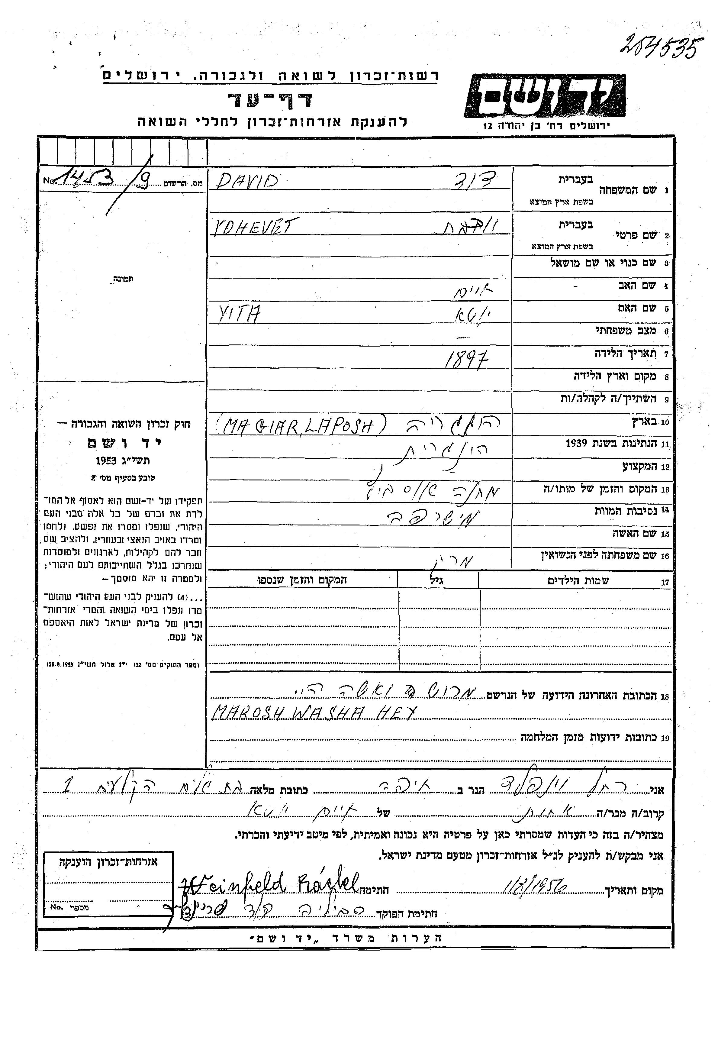 Давид Йохевед 1897 Мадярлапош, Румыния Лист свидетельских показаний