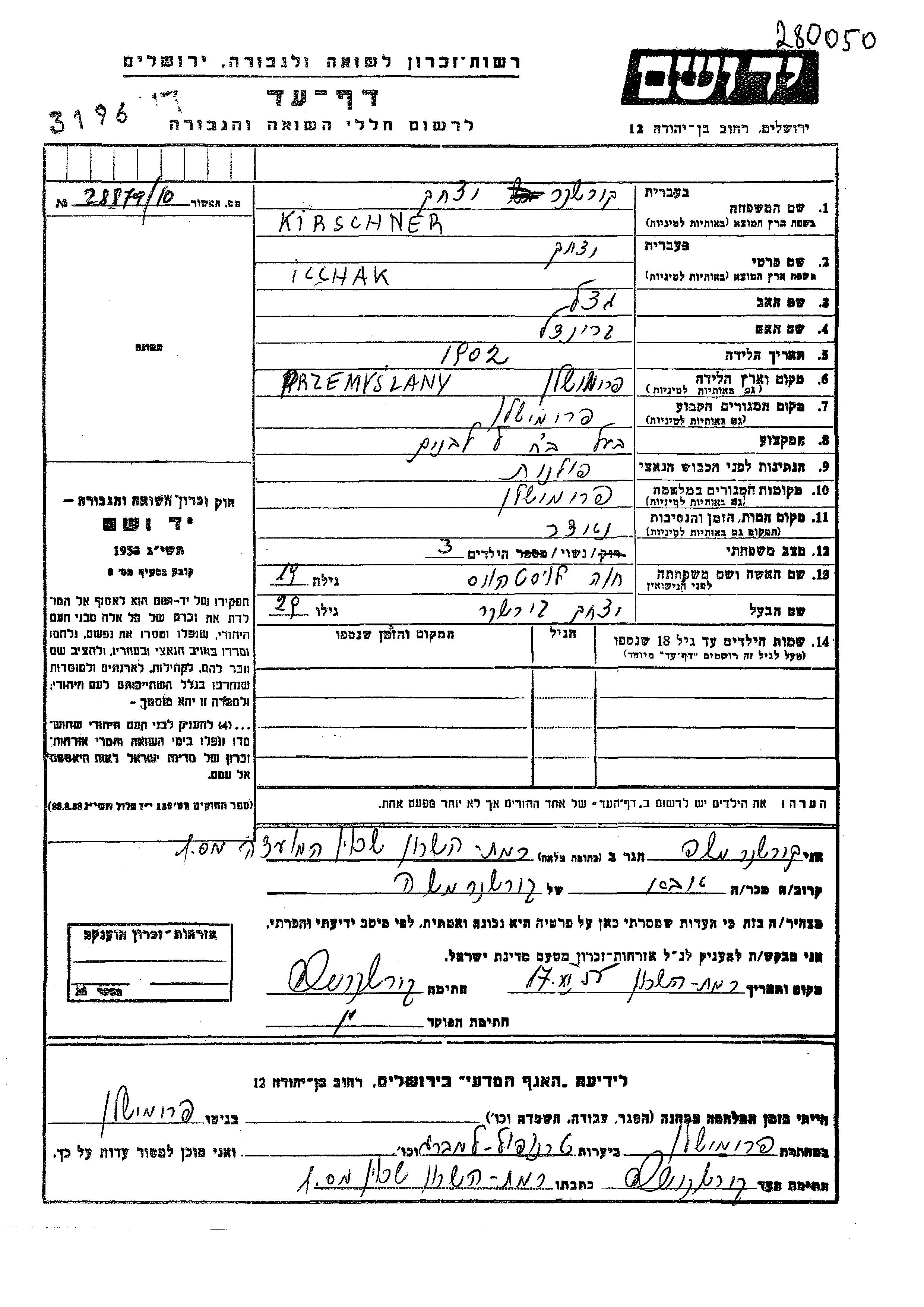 Ицхак Киршнер, место рождения: Перемышляны, Польша. Отец: Мечель, mать:Брейндл. Фабрикант. Женат / замужем. Место жительства до войны: Перемышляны, Польша. Место во время войны: Перемышляны, Польша.