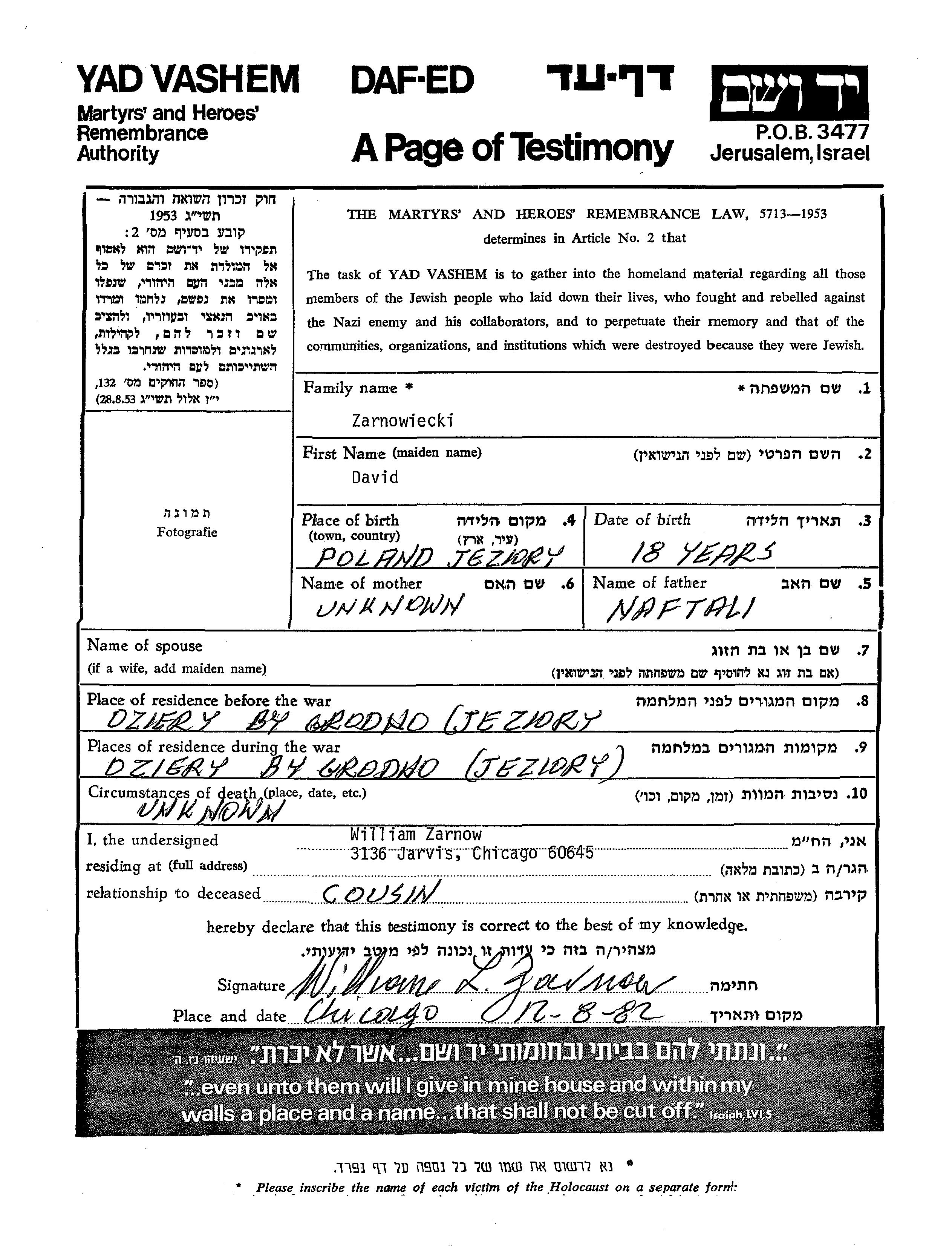 Давид Зарновецки, место рождения: Езёры, Польша. Отец: Нафтали. Место жительства до войны: Езёры, Польша. Место во время войны: Езёры, Польша.