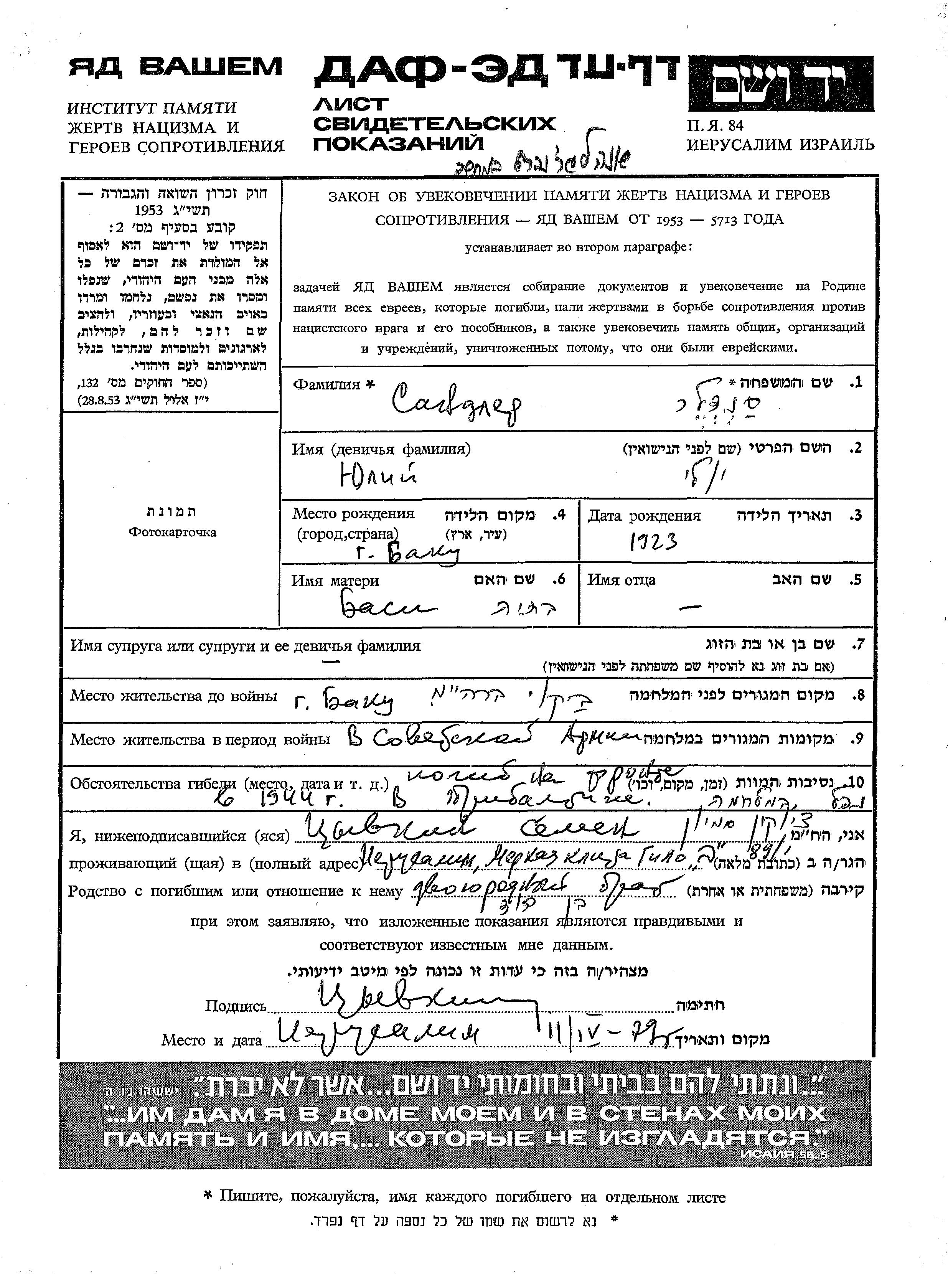 Юлий Сандлер, место рождения: Баку, Азербайджан (СССР).Mать:Беси. Место жительства до войны: Баку, Азербайджан (СССР). Место во время войны: Вооруженные силы Советского Союза. Юлий погиб на военной службе. место смерти: Балтийские Страны в 1944.