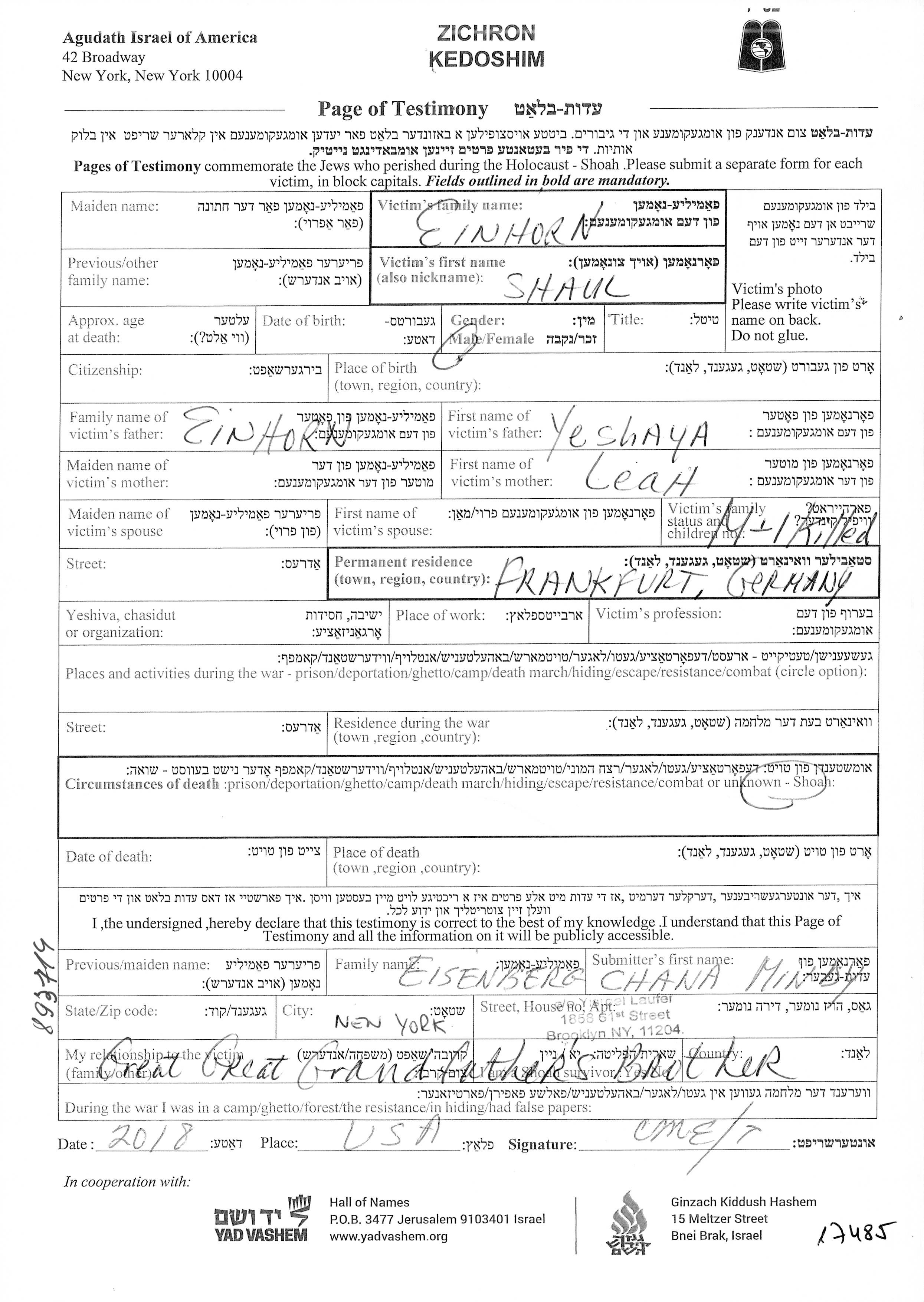 Эйнхорн Шауль Франкфурт, Германия Лист свидетельских показаний
