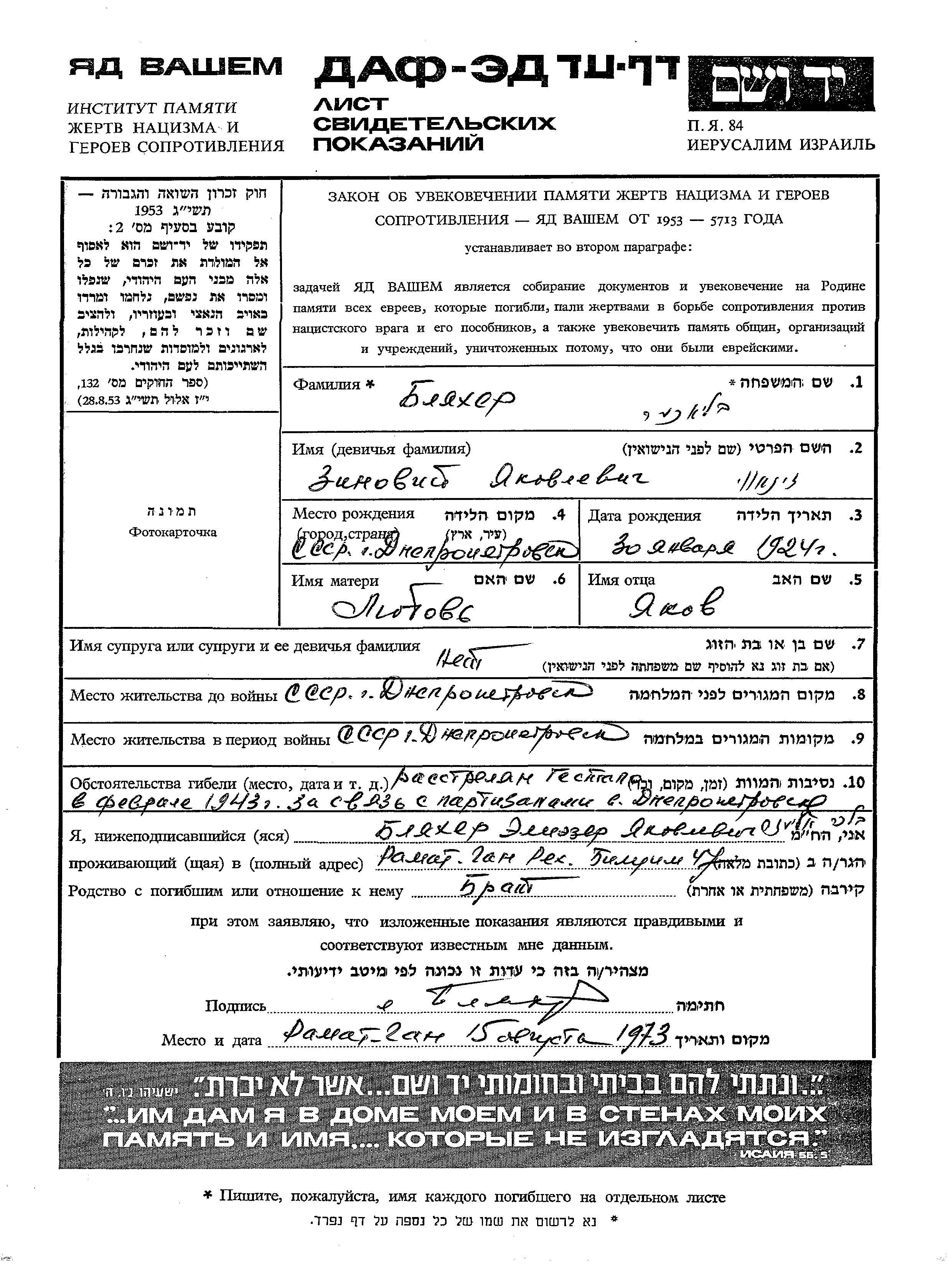Бляхер Зиновий 1924 Днепропетровск, Украина (СССР) Лист свидетельских показаний