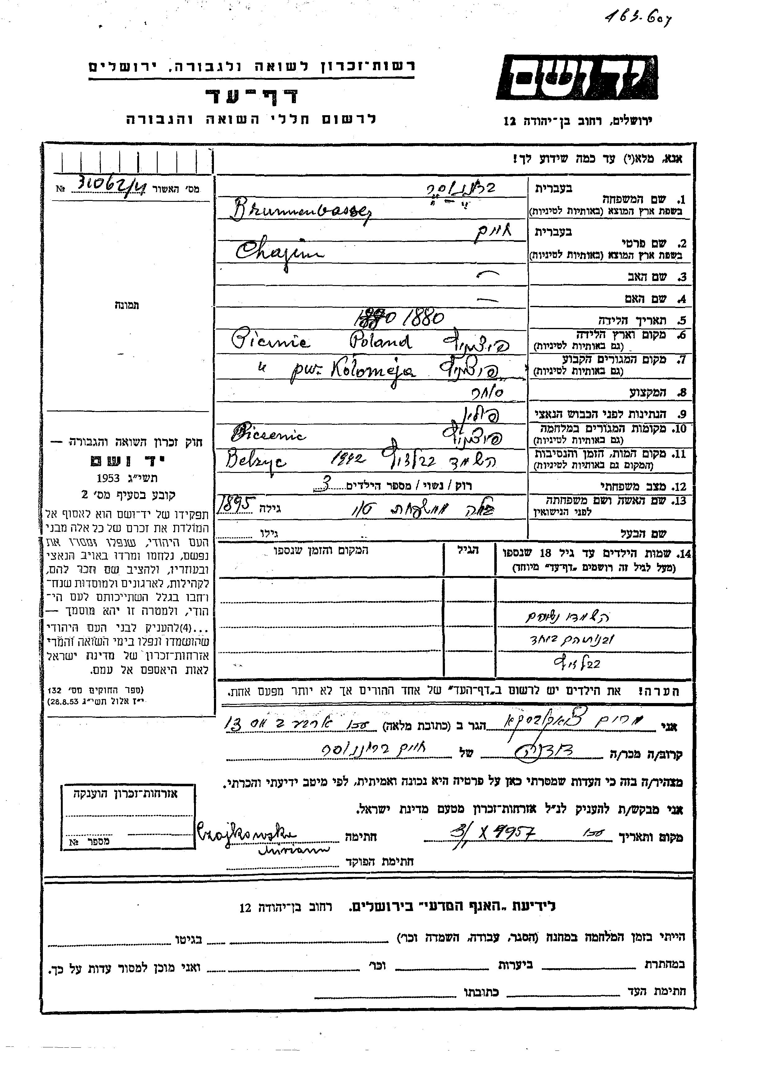 Брунненвассер Хаим 1880 Печенежин, Польша Лист свидетельских показаний
