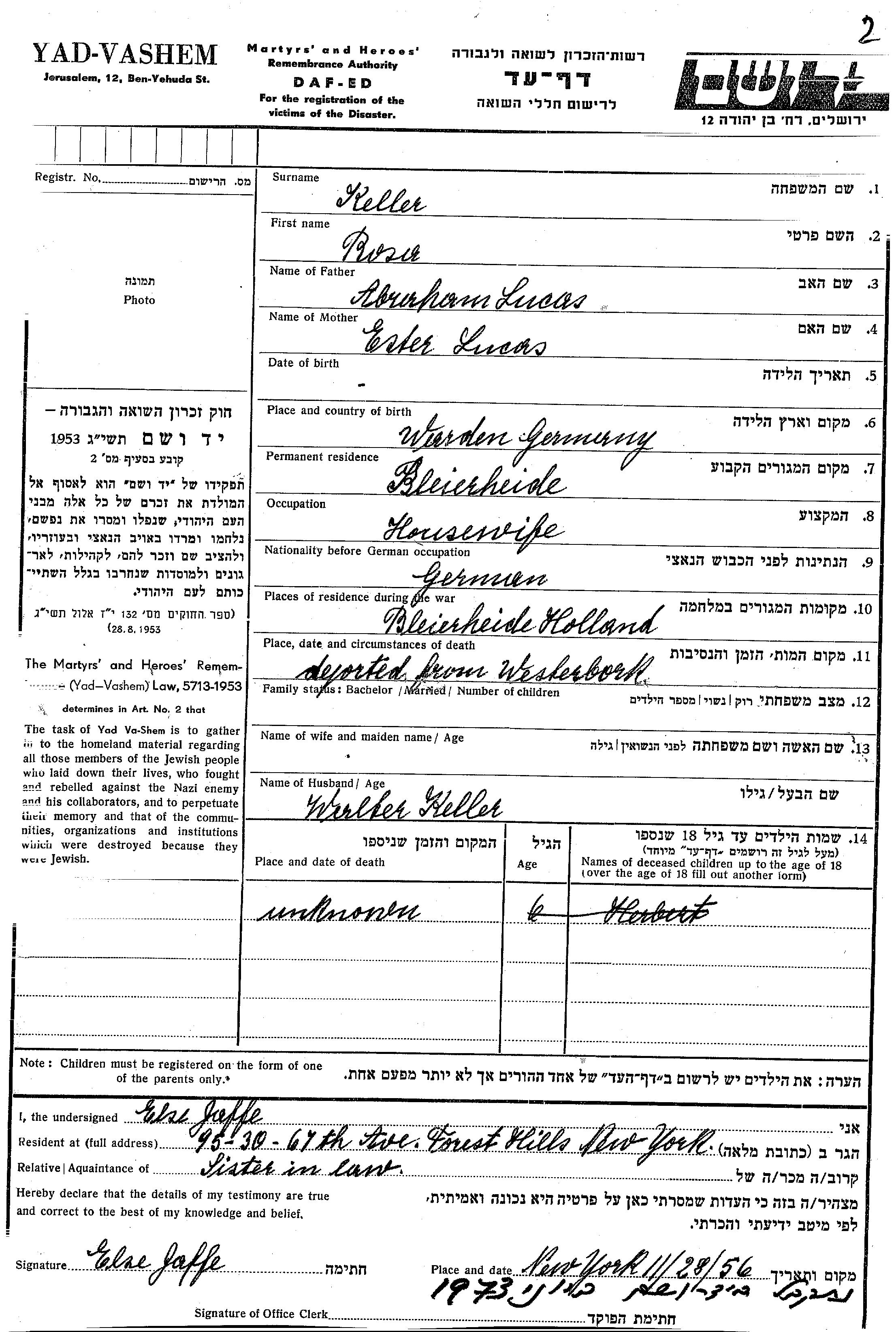 Роза Келлер, девичья фамилия Лукас, место рождения: Варден, Германия. Отец: Абрам, mать:Эстер. Домохозяйка. Женат / замужем. Место жительства до войны: Керкраде, Нидерланды. Место во время войны: Керкраде, Нидерланды.