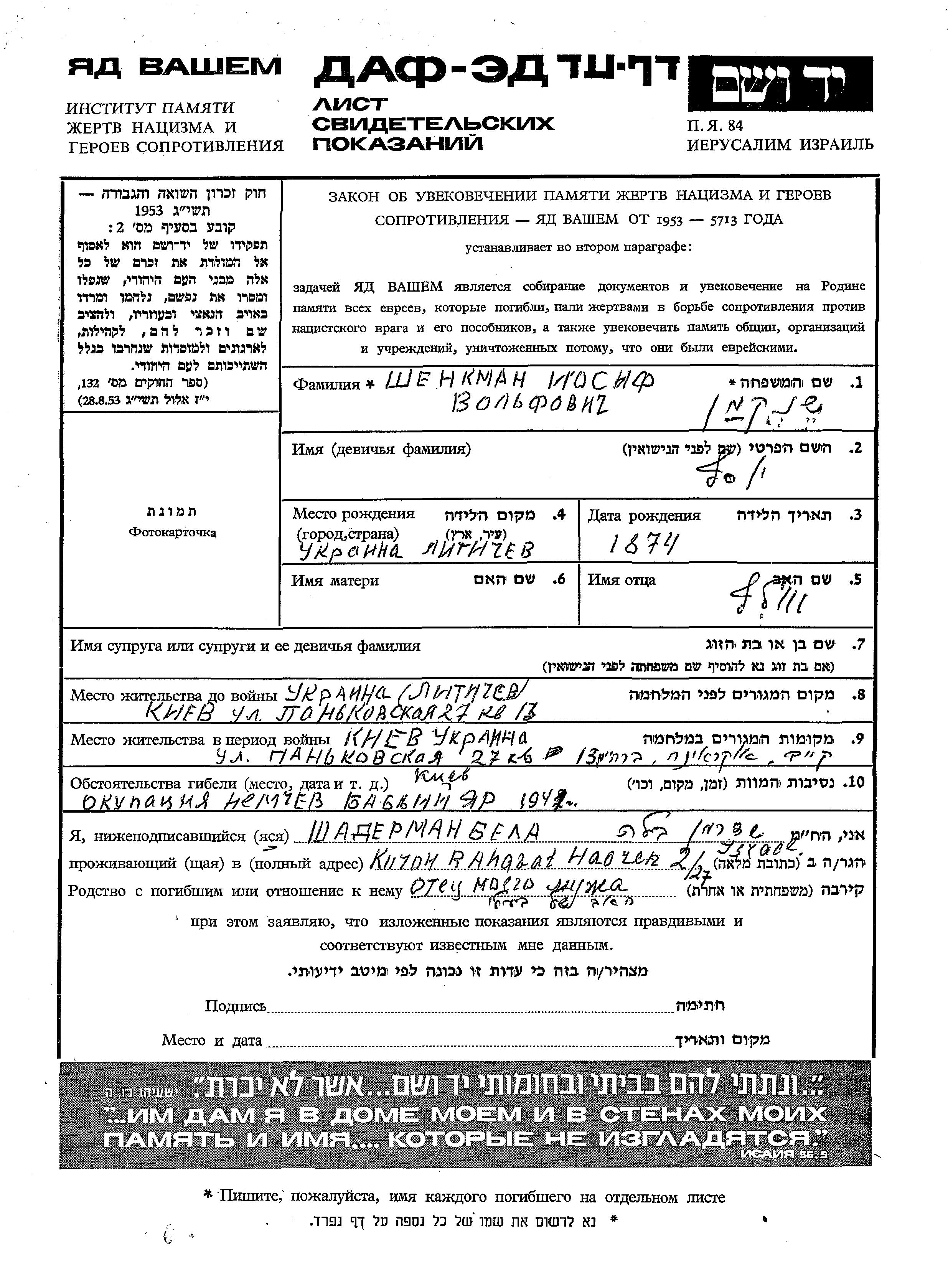Яд Вашем - Листы свидетельских показаний Мемориального фонда