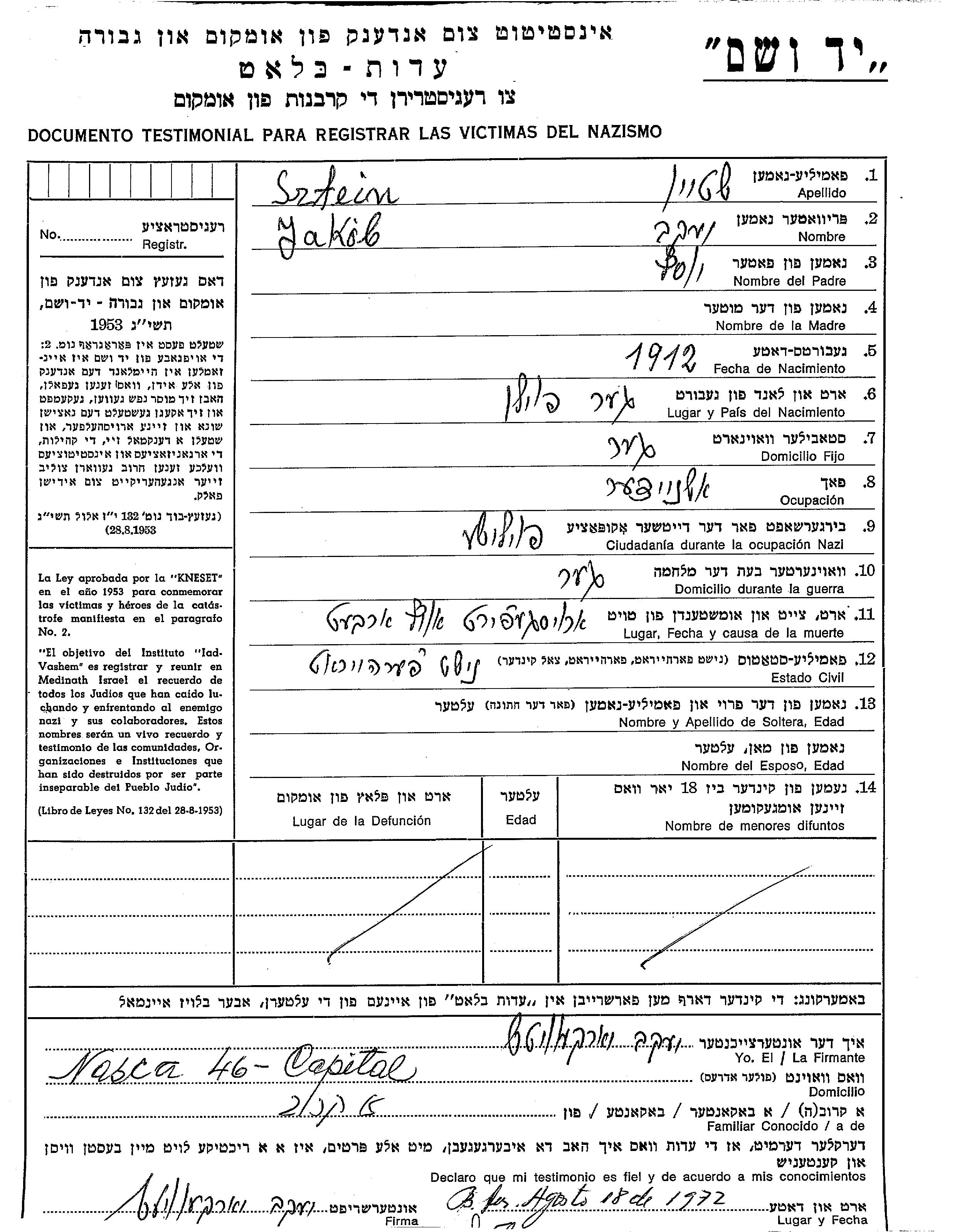Штейн Якоб 1912 Гора-Кальвария, Польша Лист свидетельских показаний