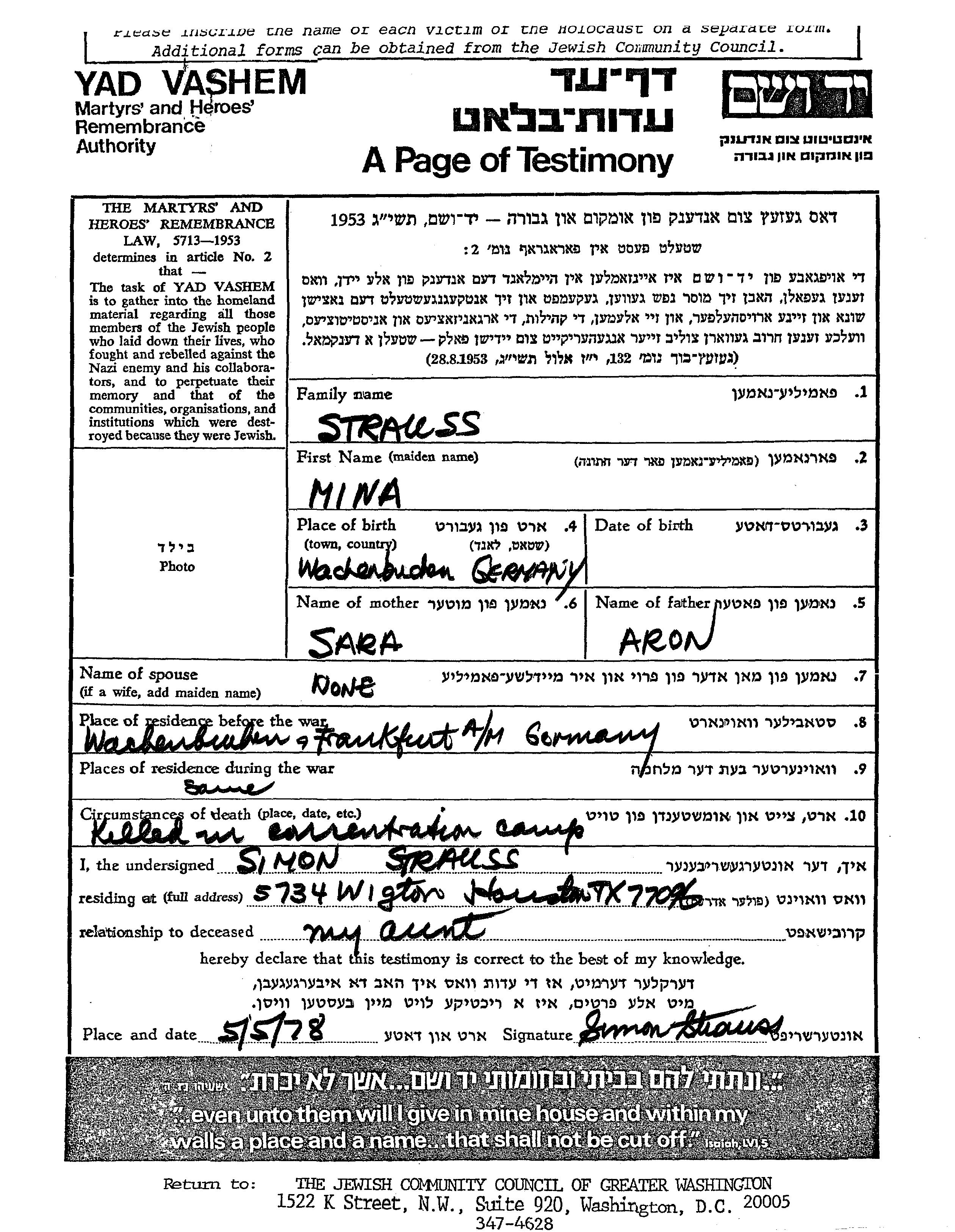 Мина Штраусс, место рождения: Вахенбухен, Германия. Отец: Арон, mать:Сара. Холост / не замужем. Место жительства до войны: Вахенбухен, Германия. Место во время войны: Франкфурт-на-Майне, Германия.